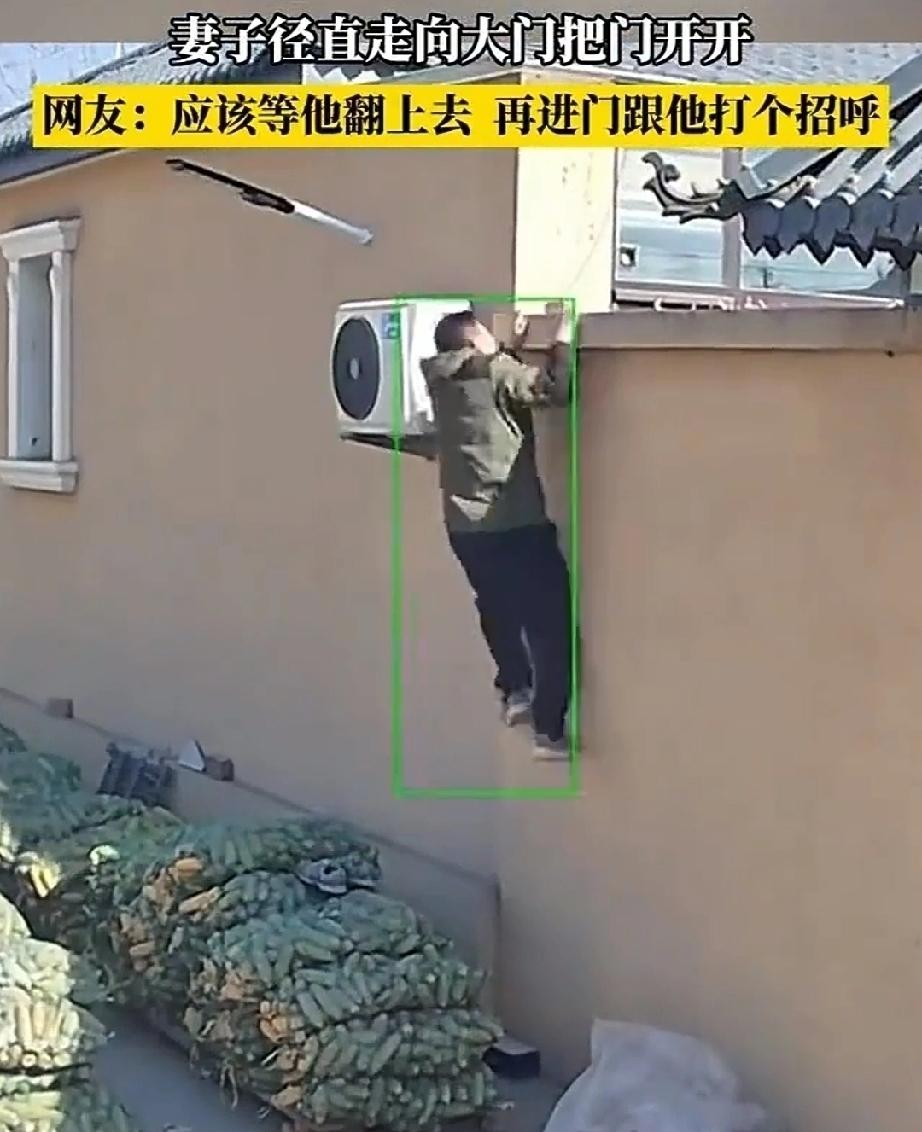 2月8日,河北。男子回家,到了大门口。一摸身上,发现钥匙没带。他想反正院墙不高,翻墙进去就是了。想得倒是容易,做起来可就难了。他站在玉米棒子的袋子上,扒住墙头,双手一用力,扣住了墙,可就是双臂撑不起来,双脚只能乱蹬,就是搭不上墙头。 妻子恰巧这时也回来了,她想看看丈夫到底能不能翻过墙去。没和丈夫打个招呼,只是冷冷的看了一眼,径直把大门打开了。 男子正在手忙脚乱的翻墙,忽然发现妻子已经把门打开。心里骂了一句,真的是个冤家,成心看我的笑话。 男子翻墙准备进家妻子直接打开大门 夫妻搞笑