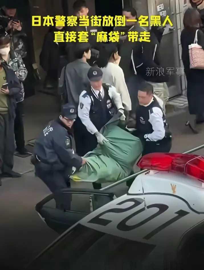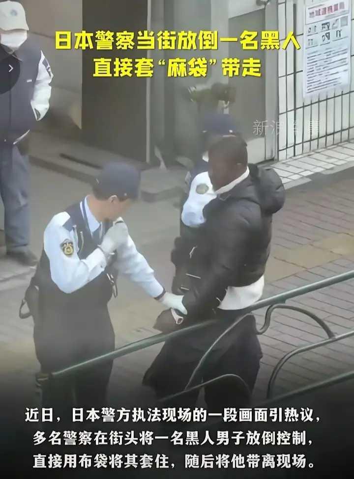 日本警察对非洲人还真的一点不客气,直接用麻袋套住,将其带走。
