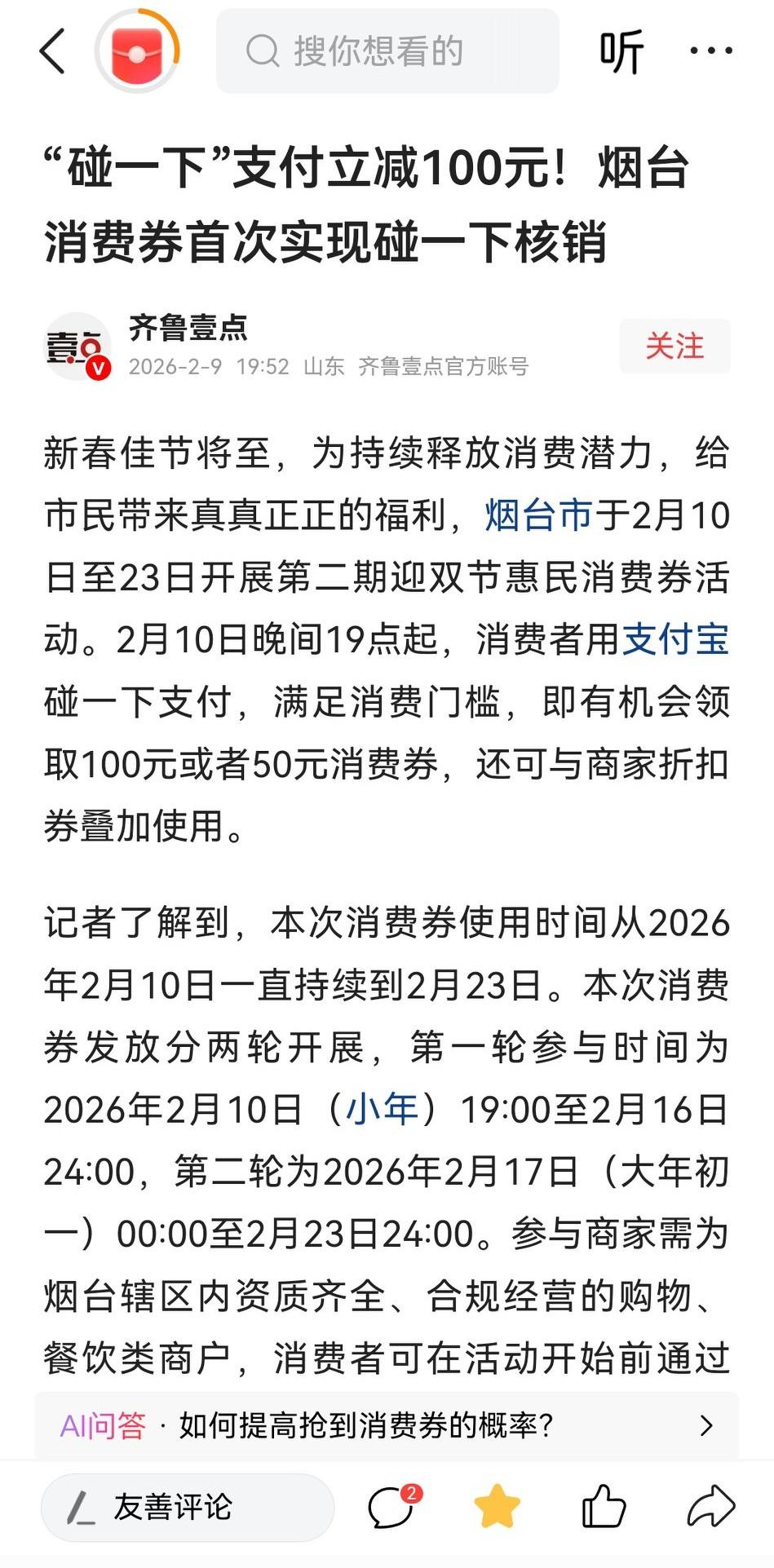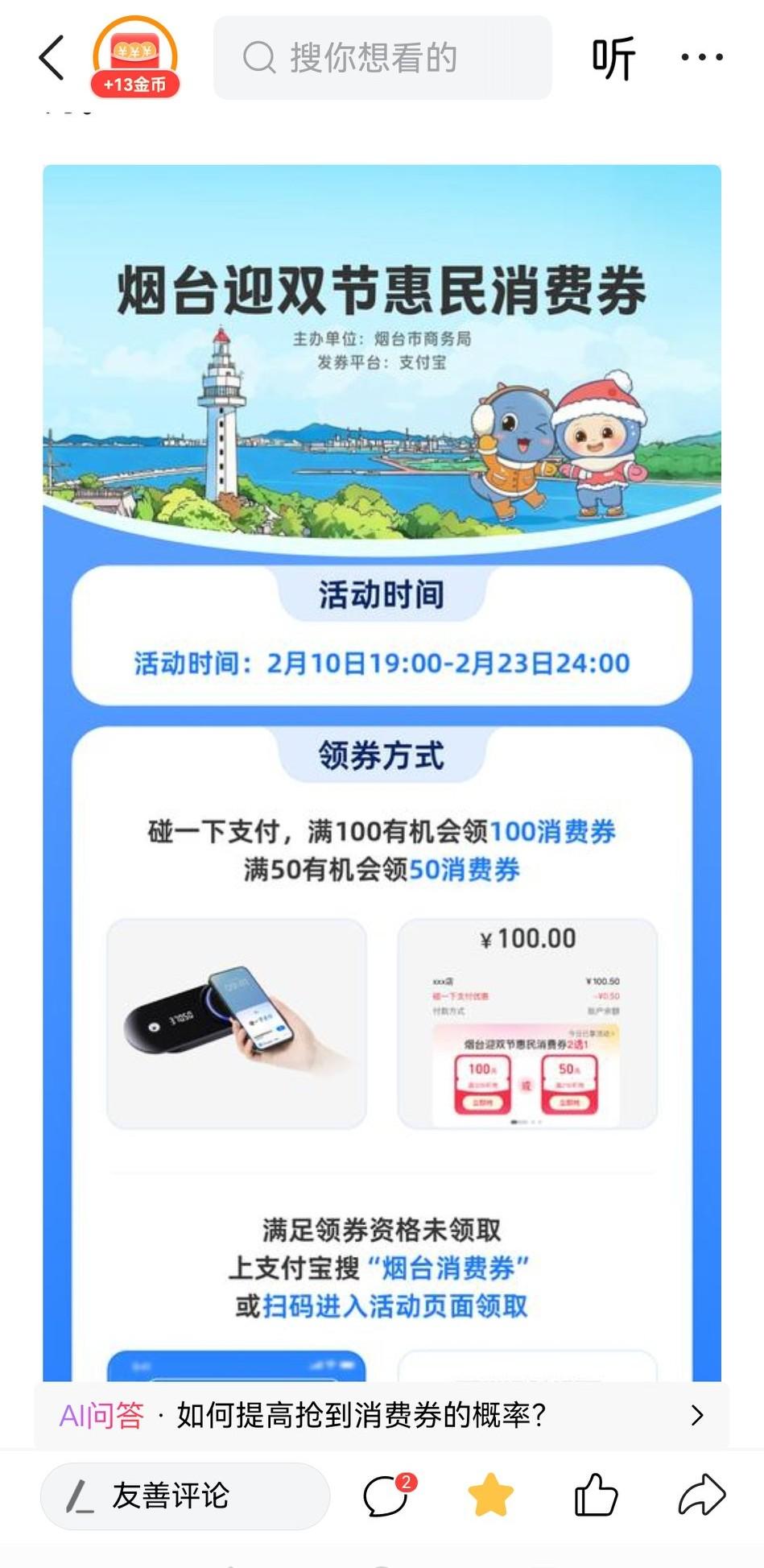 烟台第二期惠民消费券开始领了 烟台第二期惠民消费券开始领了,领券开始时间:2/9日19:00,消费场景为购物和餐饮。面值为50元或者100元。 今年的领取方式和去年不一样,往年是云闪付直接抢,今年需要通过支付宝搜索“烟台消费券”。 领取方式没太看懂,好像需要消费够了规定金额随机领取,不消费好像不能领的样子。 使用过第一期的朋友,可以说说怎么用吗?