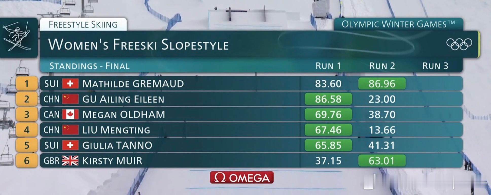 谷爱凌决赛第一轮比赛结束1️⃣🇨🇳谷爱凌:86.58分 4️⃣🇨🇳刘梦婷