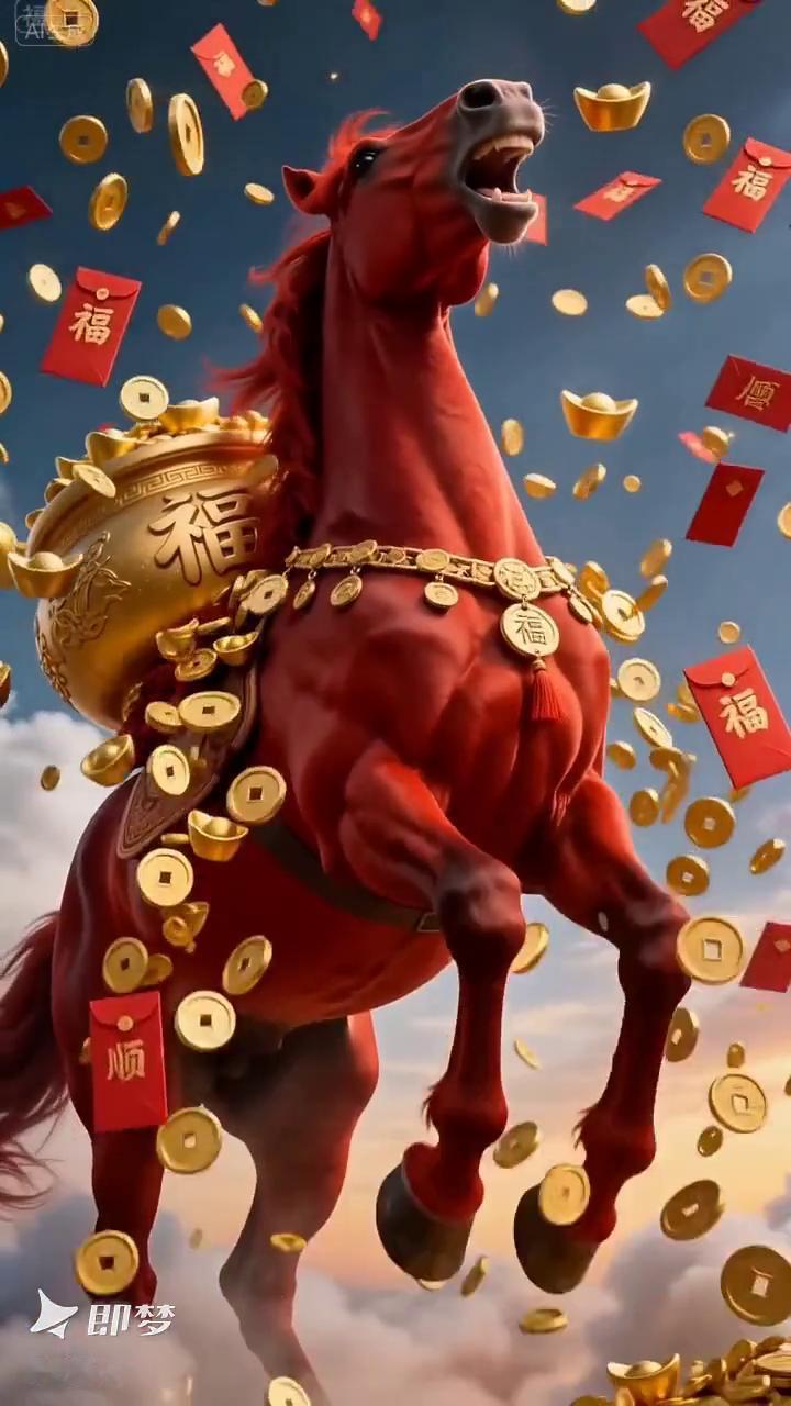 红马踏云来,新年福运开。金币元宝落,岁岁皆安康。二零二六福气到,万事顺遂速度高。