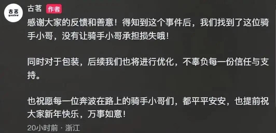 看到古茗的做法,我们看到了一个有担当有责任的大公司。 有这样的公司,打工人心绝对是暖暖的? 事情是一位外卖小哥,在取到订单奶茶的时候,却因为不小心,将所有的奶茶打翻在地,本人一时间也是愣神了,而这一幕被网友拍摄下来,并且发布到了网上。 在画面中能够看得出,满地的奶茶流的到处都是,外卖小哥也是愣神看着地上的奶茶,一时间不知道说什么好。 想必这时候的小哥想着埋怨自己,为什么不拿稳点,这一地的奶茶还要自己赔付,看购买的价格,甚至能够抵得上小哥送两天的外卖。 在面对此事,小哥也只能返回店中,用自己的钱重新购买了一份,奶茶总共是32杯。后续此事也是被网友关注,打工人的世界也太难了。 然而古茗店铺也是回应了一直被关注的事情,回复称找到了小哥,并且没有让小哥承担奶茶的损失,后续将会对包装进行重新设计优化。 此话一出,看得出古茗真的是一家暖心的公司,能够及时的做出调整和对策,当然因为小哥让古茗狠狠的火了一把,这不比广告影响力来的少。对此你们怎么看?