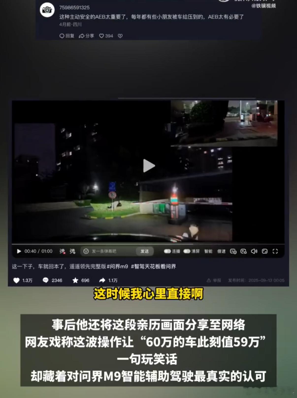 最近被问界M9星光之夜的一个真事儿刷屏了。车主徐先生在地库盲区差点碰到6个趴在地上的孩子,那种情况下人真的很难反应过来,全靠M9的AEB主动刹停避险。真的,配置堆得再高,不如关键时刻这一脚刹车。问界M9主动刹停避让盲区6个小孩 这波我站车主:60万的车此刻值59万,这59万买的是无可替代的安心啊!