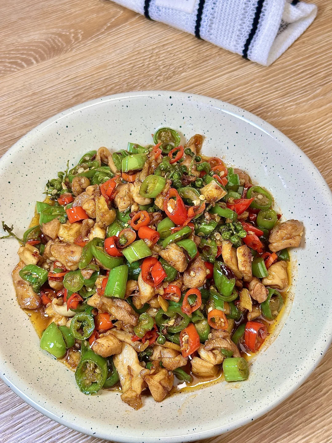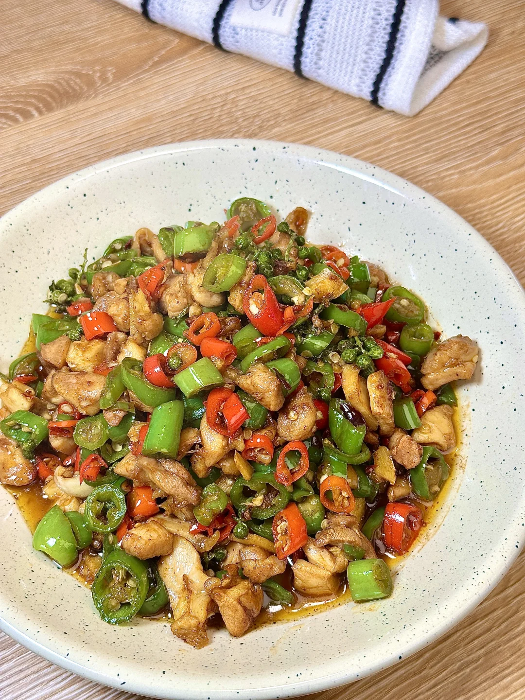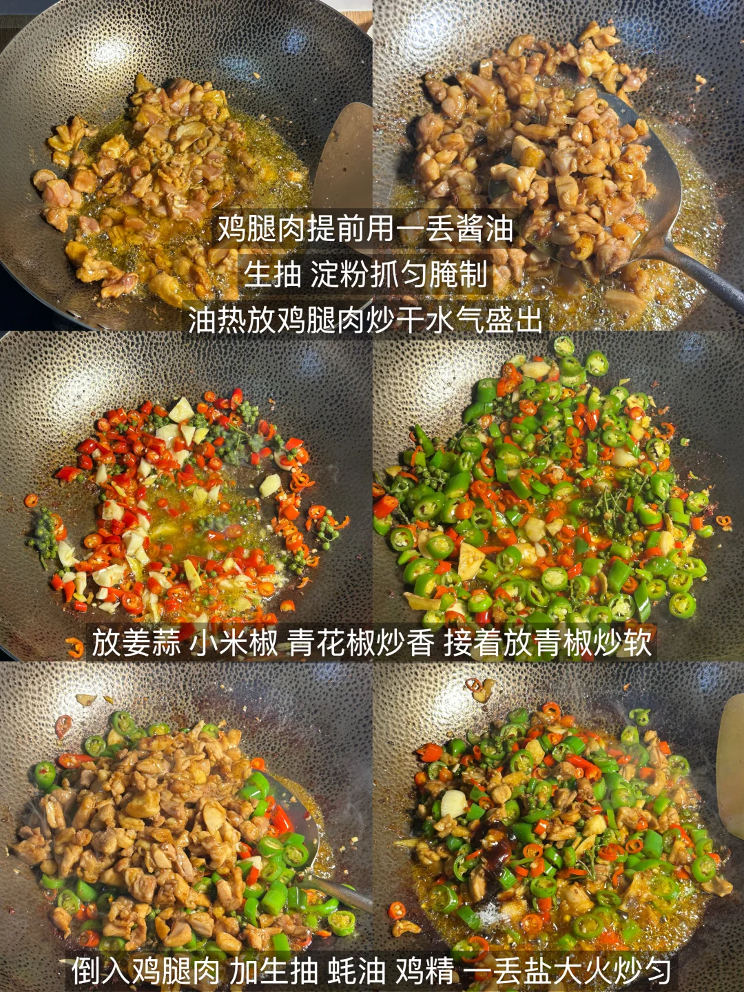 这道菜吃起来超级下饭!鸡腿肉滑嫩入味,带着青花椒的麻香和鲜辣椒的爽辣,每一口都麻辣鲜香,配米饭能多吃两大碗! ✨食材:鸡全腿两个 小米椒 青椒 青花椒 姜蒜 1️⃣:鸡腿肉去骨切小丁,加少许酱油、生抽、淀粉抓匀腌制。起锅热油,放入鸡腿肉炒干水分后盛出。 2️⃣:锅中留底油,放入姜蒜、小米辣、青花椒炒出香味,再放入青椒炒软。倒入炒好的鸡腿肉,加生抽、蚝油、鸡精和少许盐,大火快速翻炒均匀炒出锅气。 好好吃饭呀🖖🏻