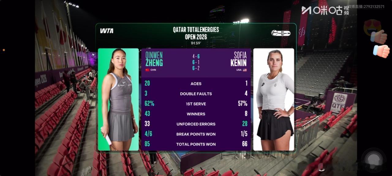 WTA多哈站,赢球的郑钦文一边鼓掌,一边微笑[呲牙],的确,她拿到20个ACE,43个制胜分,67%的破发成功率,这状态真是绝绝子啊[赞]。瞧,就连看台上的观众,都由衷地为她竖起了大拇指,太佩服她打球的韧性,毅力以及爆发力。郑钦文,打球就是让人放心,祝贺她和团队晋级第二轮。下轮郑钦文打逆转施耐德的美国选手帕克斯,继续为她加油✊郑钦文 郑钦文赛程安排 郑钦文澳网退赛 郑钦文体脂率