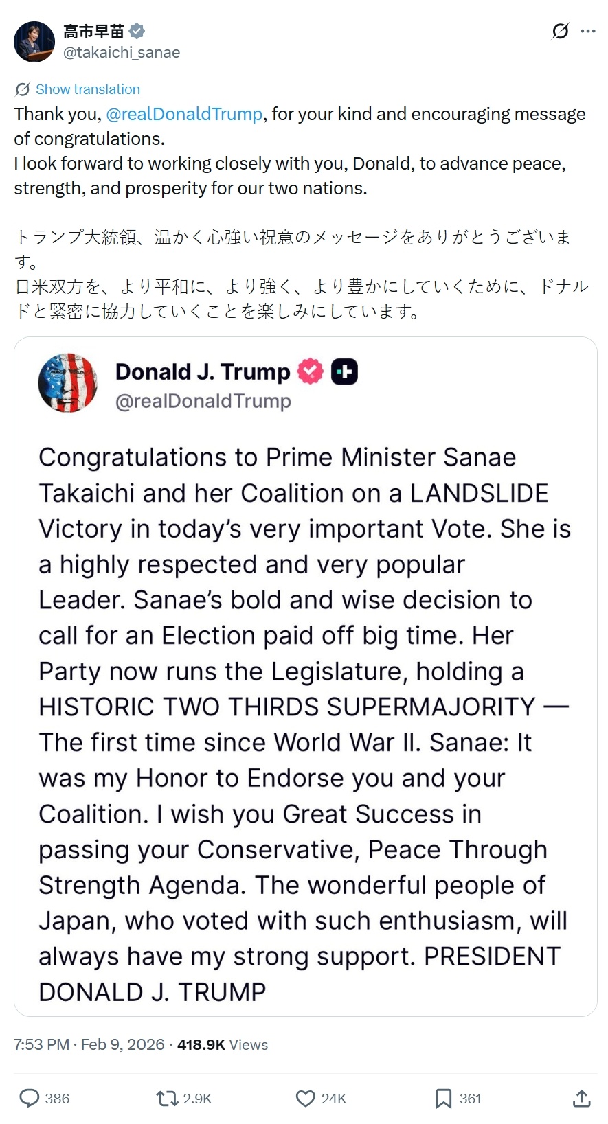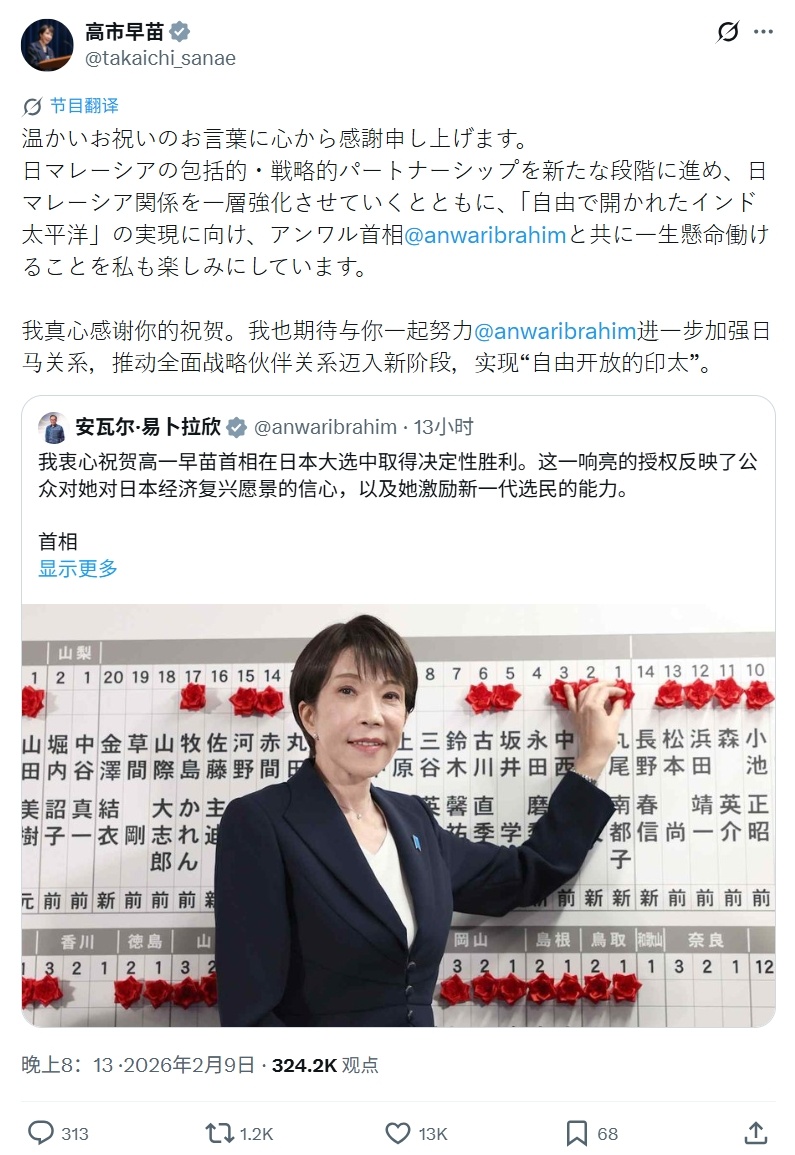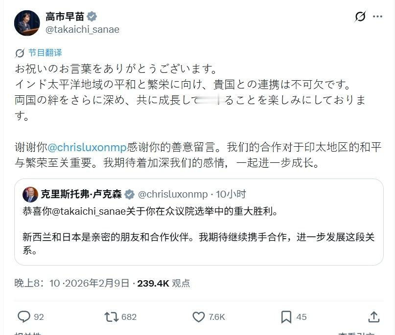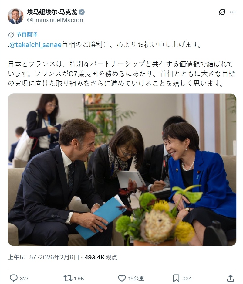 2月9号晚,高市早苗在X账号上对向其祝贺的各种政要表示感谢,包括意大利总理梅洛尼、澳大利亚总理、印度总理莫迪、新西兰总理、马来西亚总理、新加坡总理等,并再次对特朗普表示感谢,唯独没有感谢专门用日语祝贺的法国总统马克龙热点观点