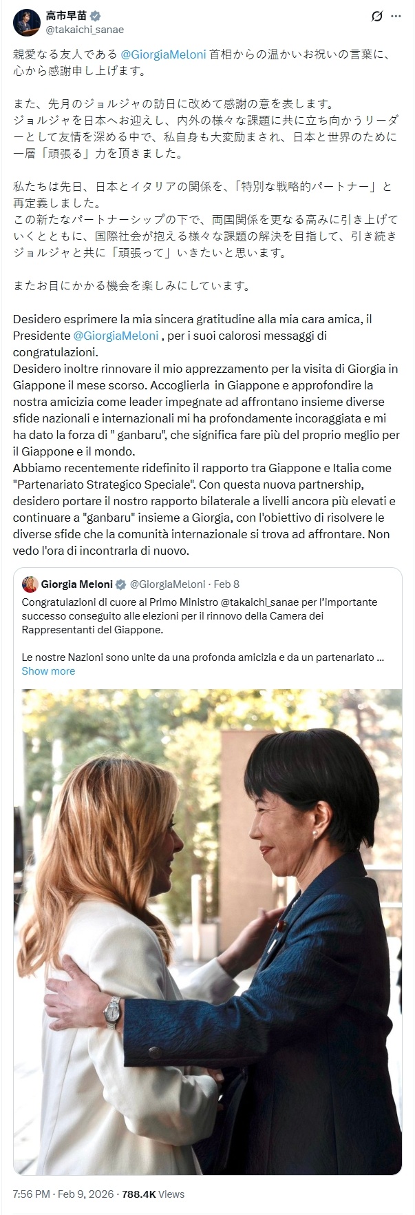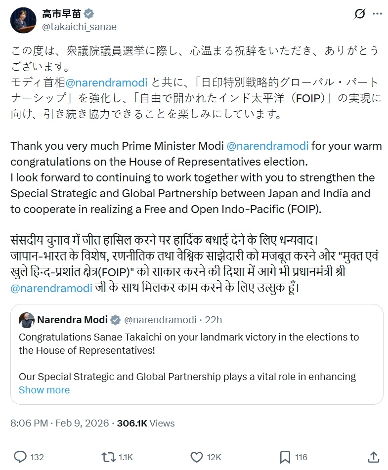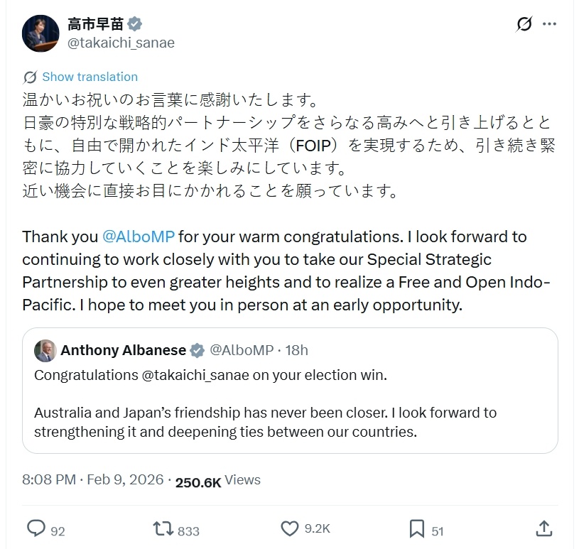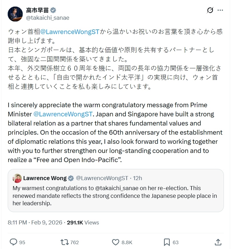 2月9号晚,高市早苗在X账号上对向其祝贺的各种政要表示感谢,包括意大利总理梅洛尼、澳大利亚总理、印度总理莫迪、新西兰总理、马来西亚总理、新加坡总理等,并再次对特朗普表示感谢,唯独没有感谢专门用日语祝贺的法国总统马克龙热点观点