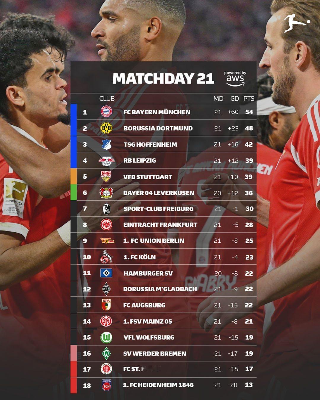 【德甲积分榜】 德甲 2025-26赛季德甲联赛第21轮积分榜。
