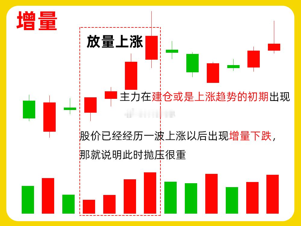 增量这个见的比较多了,股价连续的创新高,而成交量同步放大,就形成我们常说的量价齐升,成交量逐步放大,就增量形态。这种形态一般出现上涨趋势里,有持续的场外资金关注,抛压比较小