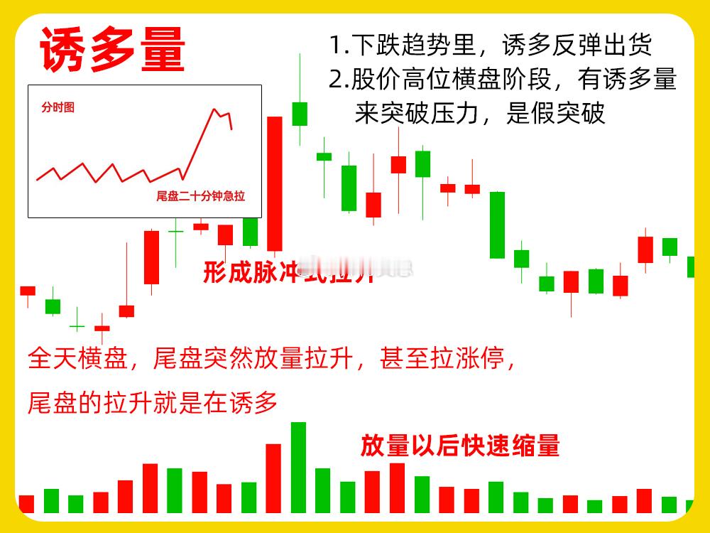 诱多量股价经过长时间的上涨以后,主力有一定上涨空间。股价出现天量,虽然此时股价会有继续创了新高,但是没有持续性,往往次日就开始缩量。而且在分时图里,也会出现冲高回落的分时走势。其实这是主力的出货