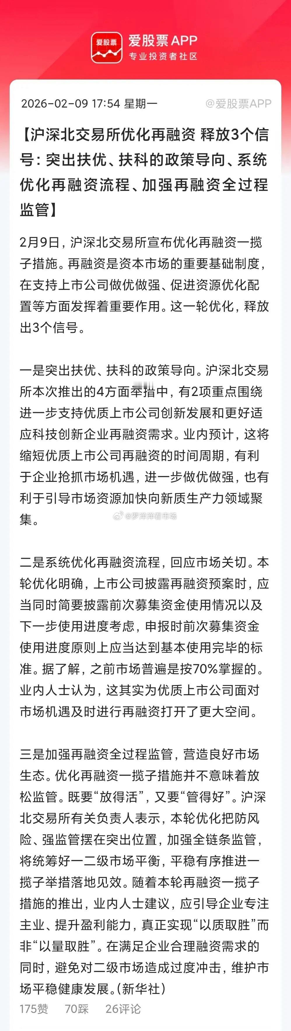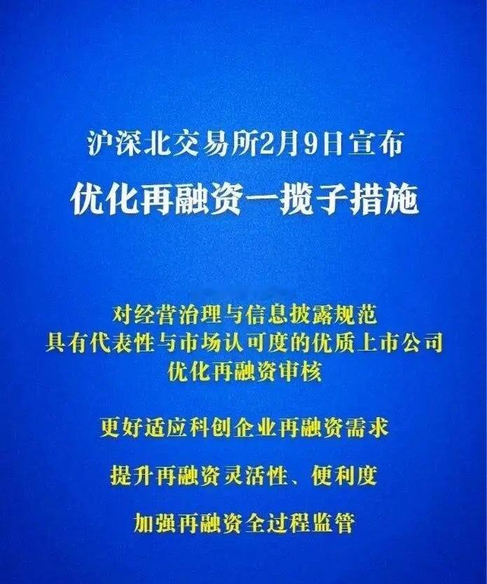 盘后三大交易所放大招,出台优化再融资一揽子措施!洋洋看了下,主要是几大变化:1、支持科技创新企业。新规明确支持“轻资产、高研发投入”企业,融资渠道将更畅通。2、优质龙头获“绿色通道”。进一步支持优质上市公司,比如有核心竞争力的科技企业,再融资间隔期缩短到6个月(之前原则上大于等于18个月),拿钱速度更快了。3、允许“破发”绩优股融资。但资金须投入主业,为主业扎实的超跌公司提供支撑。大家都知道,A股主要的融资手段并不是IPO,而是再融资。2025年IPO规模只有1317亿元,再融资高达9500多亿元,这才是大头!所以再融资的钱怎么分配,是大A能不能搞好的重要一环。之前A股IPO太多,很多公司上市圈一笔,再融资又圈一笔,钱不干主业各种跨界,不停“讲故事”,等股价炒高后大股东高位套现走人,最后散户一地鸡毛。现在再融资新规后,引导资金流向优质企业,流向科技企业,向新质生产力集中。那些基本面差、只融资不回报的公司会越来越难,以后在A股圈钱的大门慢慢关闭了!总之,这个没必要解读为利空,一看再融资就觉得洪水猛兽。现在只是优化不是放开,这个政策对于优质白马企业以及真科技是利好,让好公司早点拿到钱!A股之前再融资效率很低,很多都是一年都完不成,导致很多好公司都跑到港股上市去了。