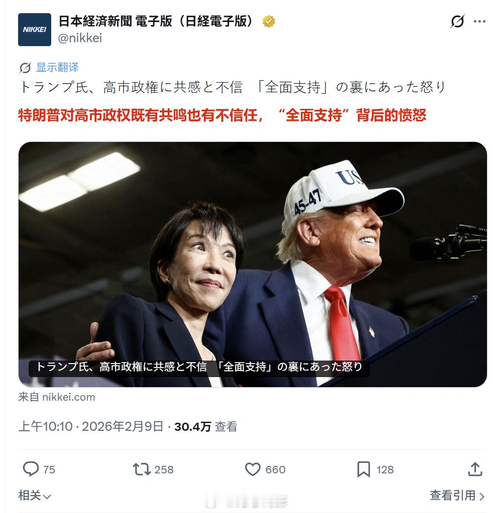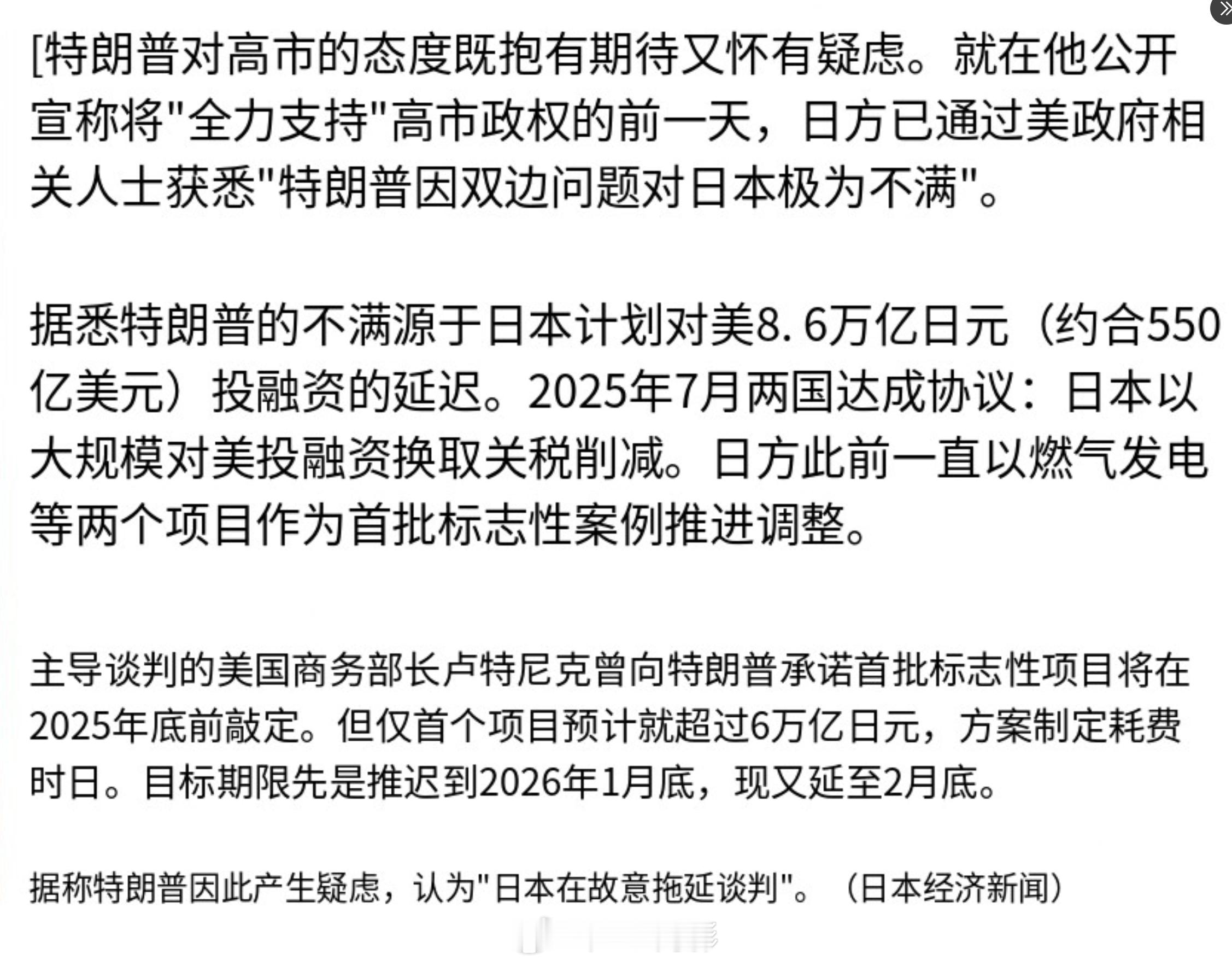 《日本经济新闻》报道称,在特朗普公开支持高市早苗的背后,他实际上对“日本感到愤怒”。日本承诺对美国的投资进度已落后于计划数月,这导致特朗普对高市府产生了不信任感,他认为日方在刻意拖延谈判。