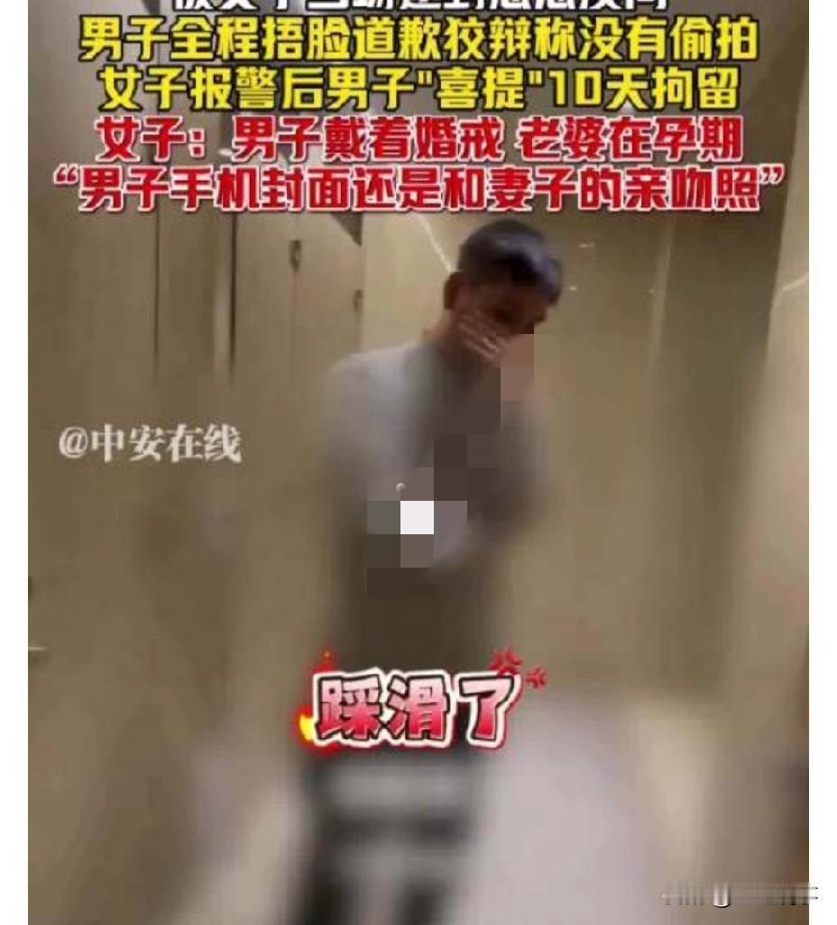 这下惨了吧,男子在女厕所偷拍摔倒被当场抓获,事情发生在2月9日的上海。 男的去女厕所偷拍,结果脚滑摔倒了,被女子当场质问。 男子全程捂脸道歉称没有偷拍。 女子选择报警,男子最终拘留10日。 这男子戴着婚戒,老婆在孕期,手机封面还是和老婆的亲吻照。 竟然在老婆孕期做这种事情,这是心理变态,不知道会不会影响他们夫妻间的感情。 毕竟得知自己的丈夫是一个这样的人,不知会作何感想。