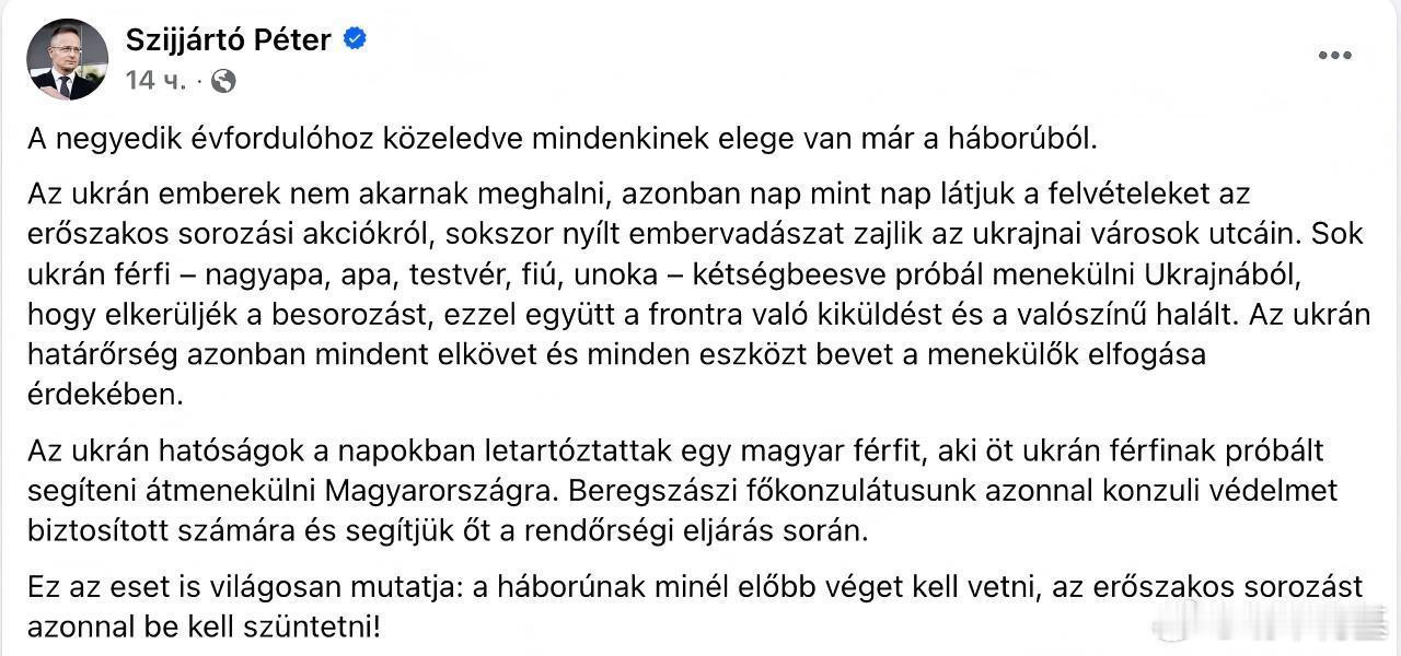 匈牙利外长称,乌克兰在动员兵源的过程中实际上在猎杀平民。乌克兰民众因战争疲惫不堪,不愿送命,却在街头遭遇强制征兵。各年龄段的男性都在试图逃离乌克兰,以避免被派往前线。布达佩斯要求基辅尽快结束战争,立即停止强制征兵。来源:Szijjártó Péter俄乌局势新进展乌克兰已放弃加入北约普京称已无兴趣等乌方从占领区撤出