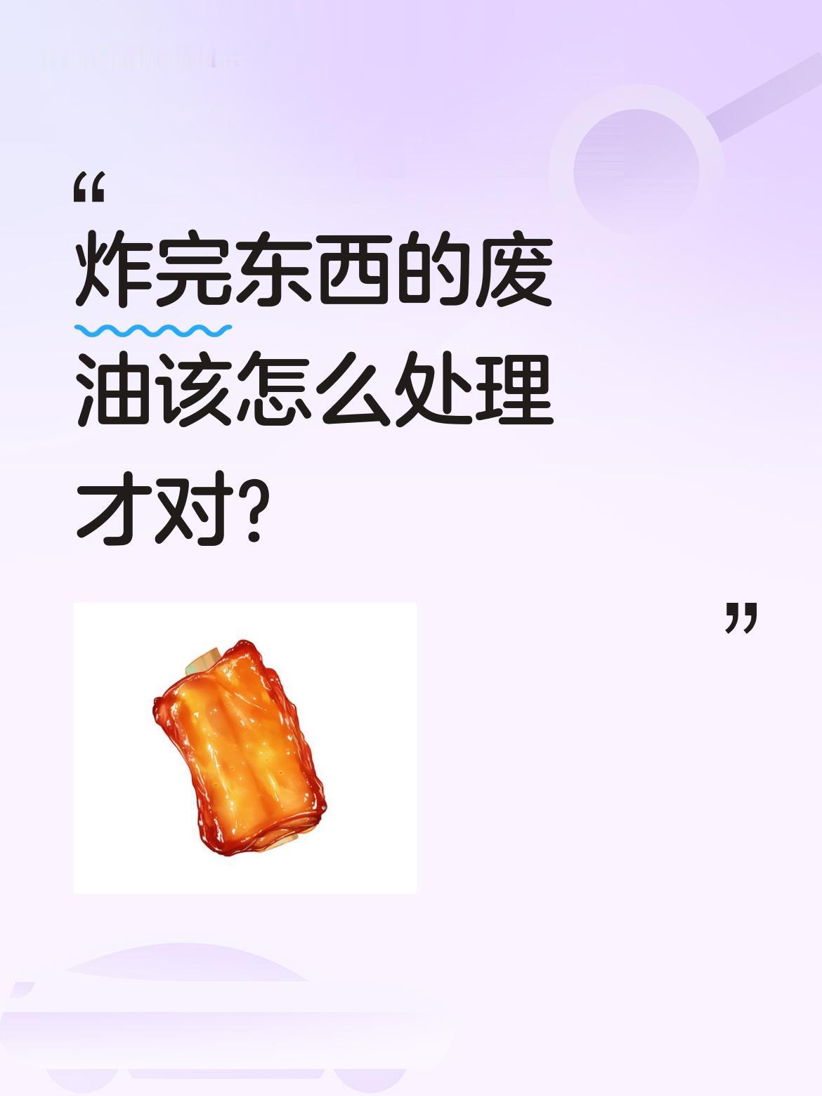 炸完东西的废油该怎么处理才对? 最近看到有网友讨论炸东西剩下的油该如何处理。有人担心直接倒下水道会堵塞管道,毕竟油污积累多了确实容易造成堵塞问题。其实废油处理有不少小技巧,比如可以用容器收集后密封,当作厨余垃圾处理,或者等冷却凝固后再丢弃。你们平时是怎么处理炸完东西的废油呢?有什么好方法吗?