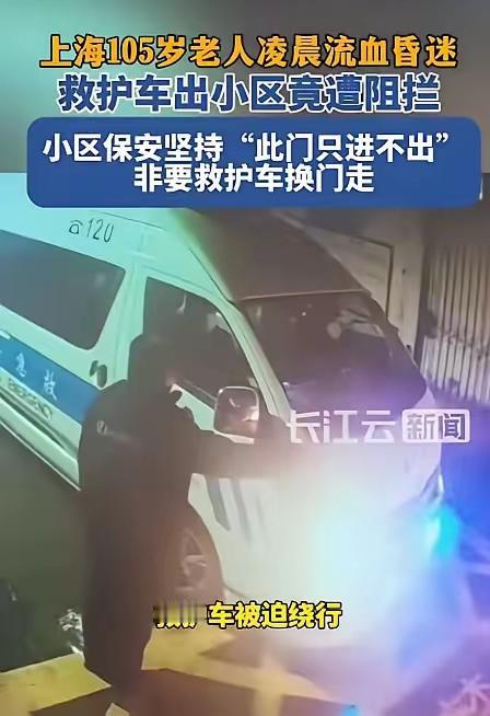 必须严惩!上海105岁老人在家摔倒昏迷,救护车紧急赶到,却被小区保安以“东门只进不出”死死拦住,硬生生绕行耽误5分钟,看得人又气又揪心。 救护人员反复说明情况,保安却只守规矩不通人情,哪怕是百岁老人救命关头也不肯变通。我认为,规矩是为人服务的,生命永远高于制度,小区大门可以设限,生命通道绝不能上锁。 保安怕被扣钱可以理解,但物业更该反思,为什么没有给员工紧急情况免责的底气?法律也明确规定,救护车执行任务必须优先通行,任何阻拦都是对生命的漠视。 幸好老人平安无事,否则后果不堪设想。你觉得这种死守规定、不顾人命的行为,该不该严肃追责?