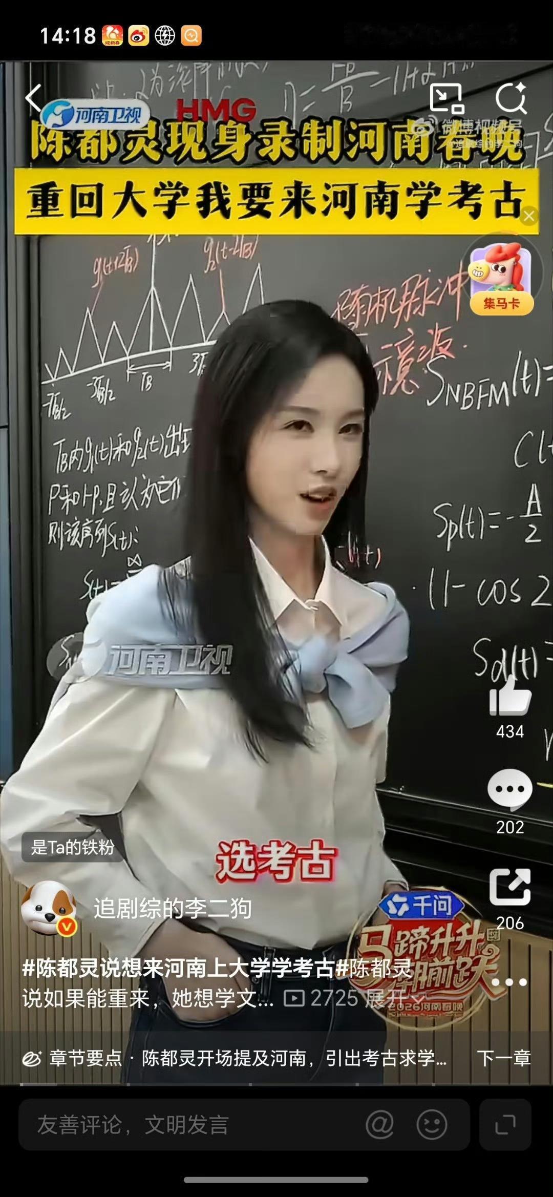 陈都灵河南春晚发言太圈粉!直言想重来学考古,被赞“文脉代言人”✨ 陈都灵现身河南春晚录制现场的一段发言,瞬间戳中无数网友!面对镜头,她坦诚表示“如果能重回大学,想来河南学考古”,这番话既显真诚,更藏着对中原大地千年文脉的由衷向往。 镜头里的她身着白衬衫搭配浅蓝领结,站在写满公式的黑板前,气质清新又温婉,仿佛瞬间梦回“校园女神”模样。作为曾经的南航校花,她本就以高学历出圈,如今主动提及对考古专业的喜爱,不仅打破了大众对“流量女星”的刻板印象,更让网友直呼“学霸的浪漫太戳人”。 河南作为中华文明的重要发祥地,考古资源得天独厚,陈都灵的这番表态,也被网友调侃“是提前解锁河南春晚‘文脉代言人’身份了”。此次登上河南春晚舞台,对她而言或许也是一次沉浸式感受中原文化的机会,不少观众已经开始期待,这位兼具颜值与才情的女星,会带来怎样贴合河南底蕴的精彩表演。 陈都灵河南春晚说想学考古 陈都灵 河南春晚 考古情怀