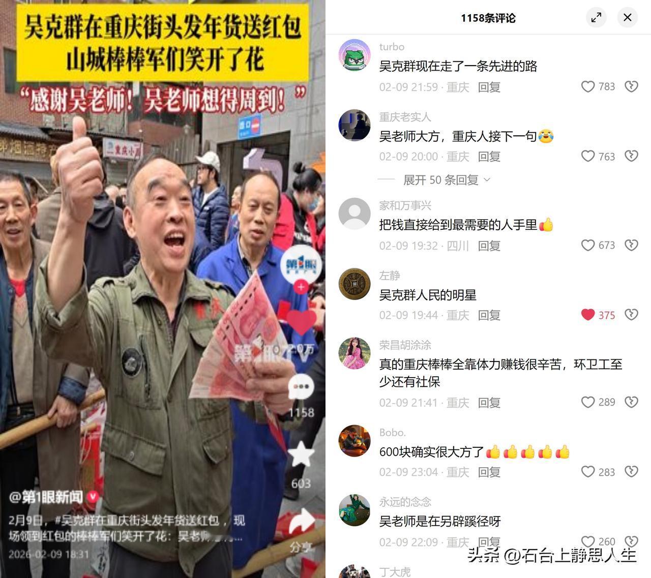 吴克群给重庆棒棒发600元红包 没有排场十足的发布会,也没有对着镜头的刻意摆拍,就蹲在街头,把年货和红包塞到那些攥着扁担、满是老茧的糙手里。领到的老人笑开了花,连说“吴老师想得周到”。 这事儿能打动这么多人,不止是因为红包实在,更是击中了大家对花架子慈善的腻味,太多时候,慈善是拍给镜头看的晚会,是写在通稿里的数字,钱没落到真正需要的人身上。再看看这群棒棒军:平均年龄50+,月入不足3000,没社保没保障,连环卫工都有的基础福利,他们都难摸到。这群被快递、物流挤到城市角落的最后一代棒棒,不需要镜头前的曝光,只要过年能添件新衣服、给孙辈包个红包的实在。 在这个流量至上的年代,这种不玩虚的善意,比任何热搜都金贵。
