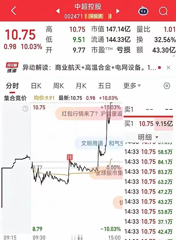 今天在中超控股上,算是体验了一把心跳过山车。上午看它分时图来回震荡,午后突然直线拉升,眼看就要冲涨停,脑子一热,在分时高点直接全仓梭哈。刚点下确认键,心里还在暗喜,觉得自己终于跟上了主力的节奏。结果刚买完,股价就开始小幅回调,盯着屏幕手心直冒汗,生怕这是主力出货的信号。毕竟32.56%的换手率摆在那儿,这么大的成交量,谁知道是进场还是离场?就在坐立不安的时候,下午14:33,一笔几十万手的大单直接把股价封死在10.75元涨停板上。看着账户里的浮盈,悬着的心才终于落了地。