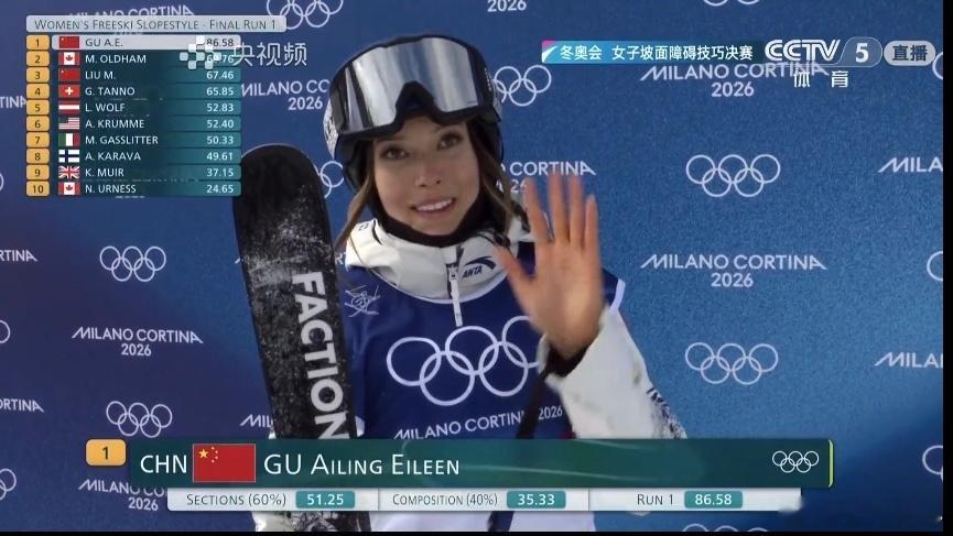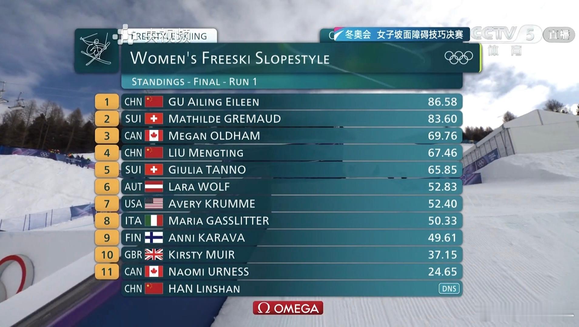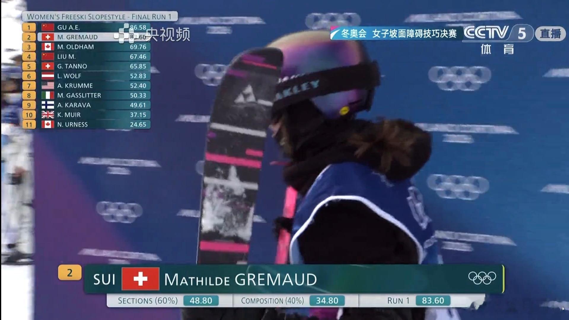 自由式滑雪女子坡面障碍决赛第一轮比赛结束,谷爱凌以86.58分排列第一;卫冕冠军格雷莫德83.60分排名第二刘梦婷67.46分排名第四谷爱凌完成1260谷爱凌决赛