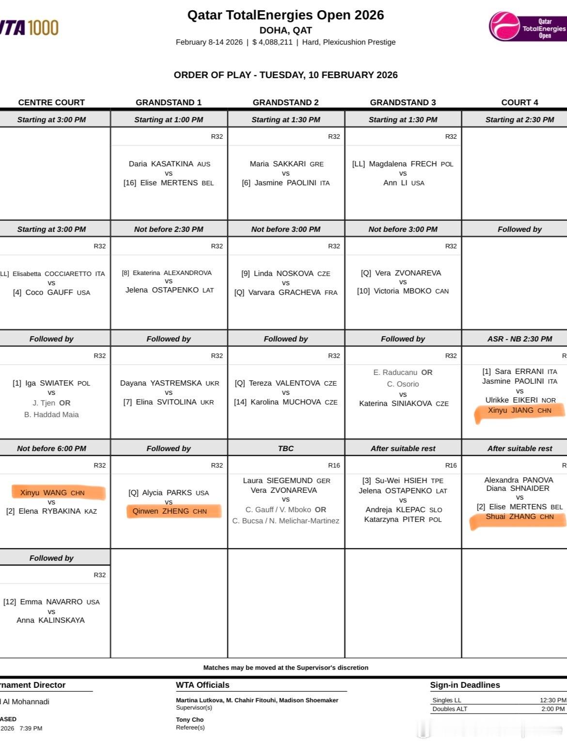 🎾2.10🇶🇦多哈WTA1000站赛程1号球场第四场 约⏰24:00🇨🇳郑钦文vs帕克斯🇺🇸