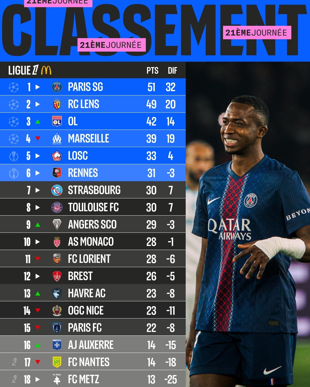 【法甲积分榜】 法甲 2025-26赛季法甲联赛第21轮积分榜。