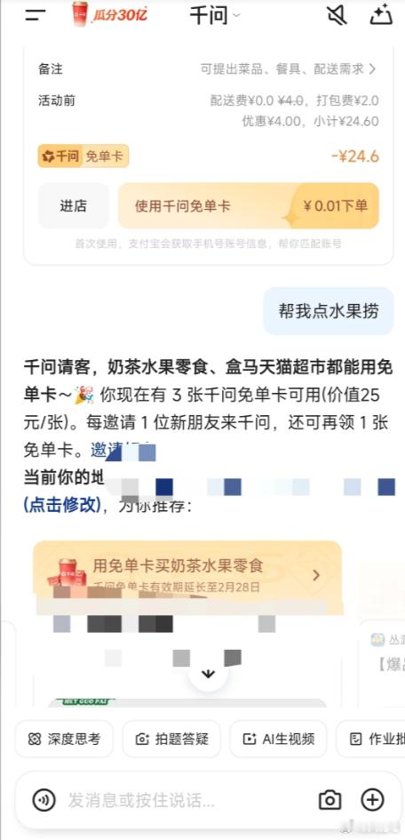 比方说过年的时候买点什么蔬菜呀,生鲜啊,或者买一些年货,一句话,就选购下单,一气呵成。你再想想之前还得到处挑,到处纠结,或者出门走半天排很长的队,这才是真的解决了很多用户需求的东西。另外,现在更新千问就能领25元免单卡,1分钱喝奶茶,美滋滋。