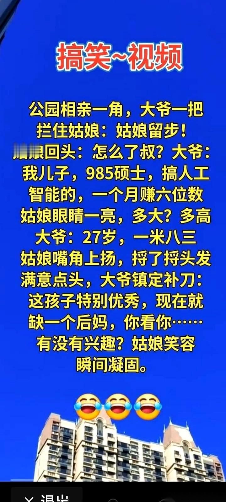 公园相亲角,一个大爷拦住个姑娘。 姑娘正要绕开,大爷张嘴就是王炸:“我儿子,98