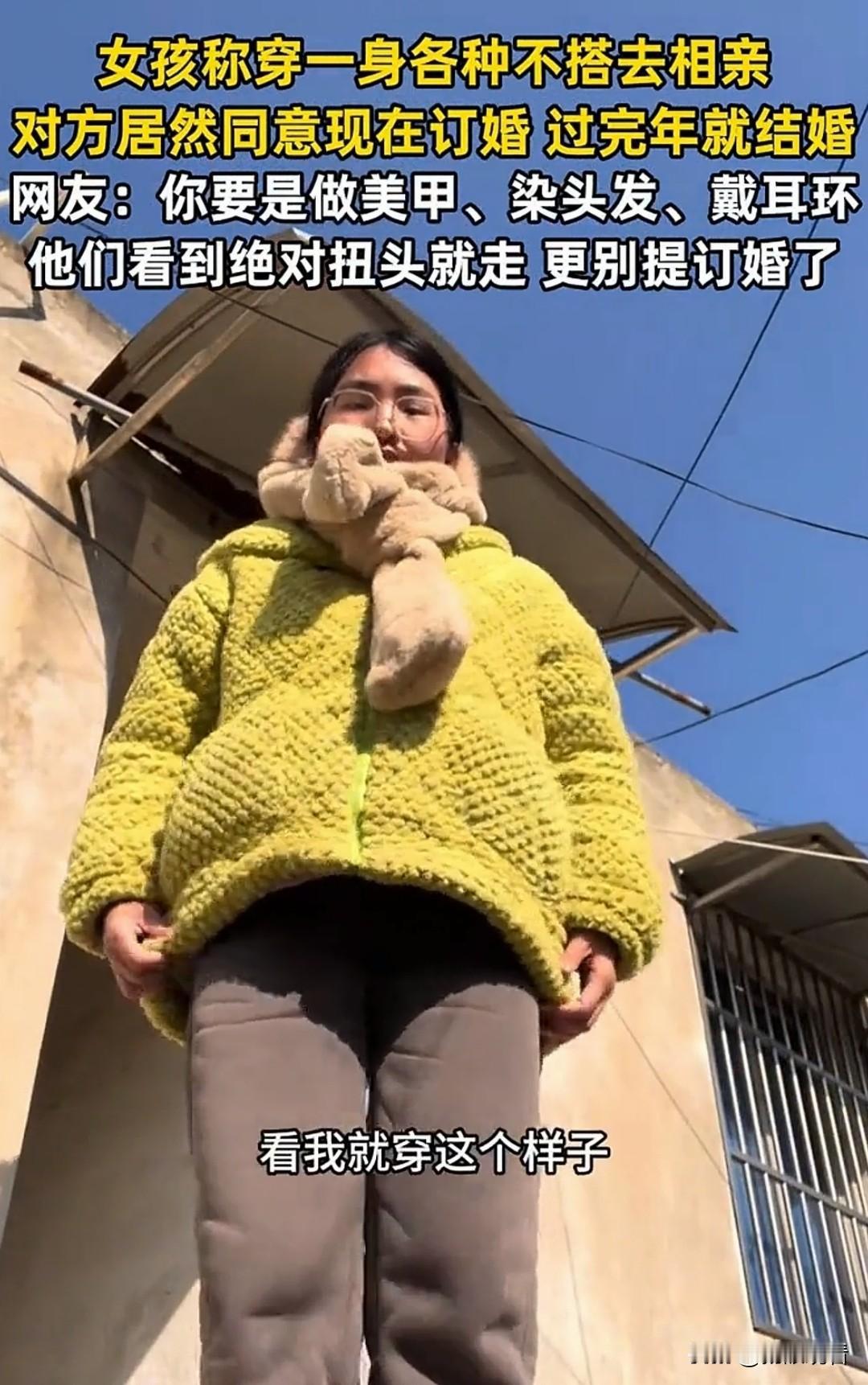 谁懂啊!故意穿得很丑去相亲 直接被订婚了😂 女孩本来根本不想相亲 出门特意随便穿 全身不搭、邋里邋遢 主打一个让对方主动拒绝 结果!! 对方非但不嫌弃 还特别满意 现在直接聊到订婚 过完年就要结婚了… 网友评论太真实了: 你要是精心打扮、做美甲染头发戴耳环 他们大概率扭头就走 反而素面朝天、穿得朴素 直接被认定是踏实过日子的人 果然相亲顶级玄学 摆烂穿搭=命中良缘 这波反向操作我狠狠记住了!