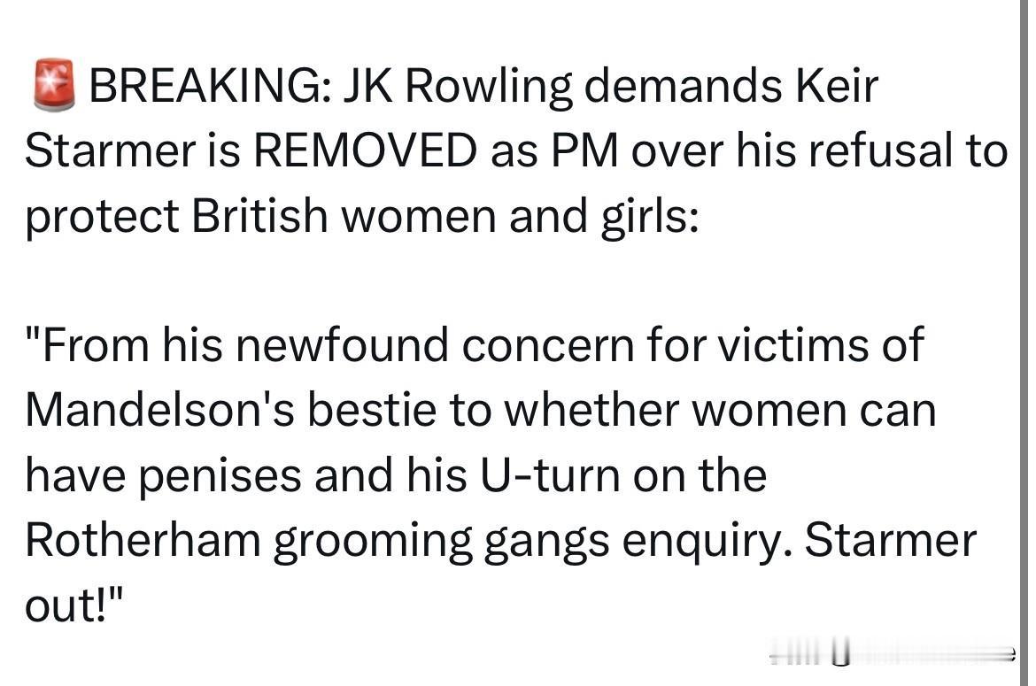 突发新闻:《哈利波特》的作者JK·罗琳,公开要求现任英国首相基尔·斯塔默因拒绝保护英国妇女和女孩而被免去首相职务: “从他对曼德尔森(前英国驻美大使)好友受害者的突然关注,到质疑女性是否可能拥有阴茎,再到他对罗瑟勒姆性侵团伙调查的180度大转弯。斯塔默下台!”