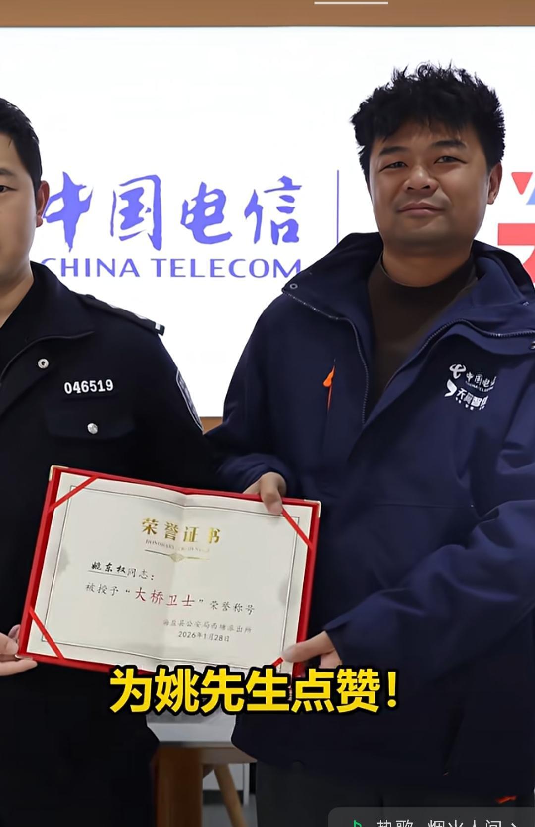 近日,潍坊街头一段监控视频刷爆了朋友圈:姚先生驾驶的理想车在桥上突然急刹,他甚至没来得及锁车,就朝着桥边飞奔而去。原来,一名女子正爬上护栏想要跳河。 短短十几秒,姚先生的动作一气呵成:冲刺、拽住、拉回,整套动作快得让人来不及反应。当女子被稳稳拉回安全区域后,他等警员来后,便转身开车离开,没有留下姓名,也没有接受任何感谢。' 被找到后,海盐县公安局为他颁发他“大桥卫士”荣誉证书。这时出现在镜头前,大家才看清他的模样——穿着中国电信的工装,笑容憨厚,眼神里透着山东人特有的实在。 评论区里,有人说“粗犷的外表下藏着菩萨心肠”,也有人感慨“这才是理想车主该有的样子”。更戳人的是那句“救人一命胜造七级浮屠”,我们总说“世态炎凉”,但在关键时刻,总有陌生人愿意为你拼尽全力。 姚先生的选择,没有惊天动地的口号,只有刻在骨子里的善良。他的急刹,是本能的反应;他的离开,是不求回报的坦荡。这正是普通人最动人的英雄主义:不必身披铠甲,也能在他人危难时挺身而出。 生活或许布满荆棘,但总有人偷偷爱着你。就像网友说的:“无论遇到什么挫折都不要轻生,沉下心解决问题。”愿我们都能被这世间的温柔接住,也能成为接住别人的那双手。姚先生 大桥 “大桥卫士”