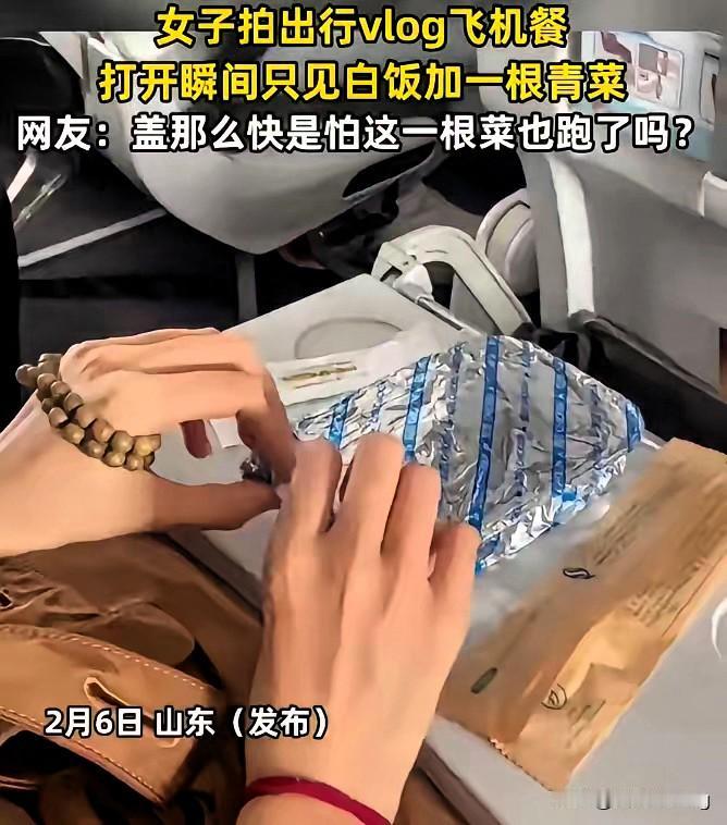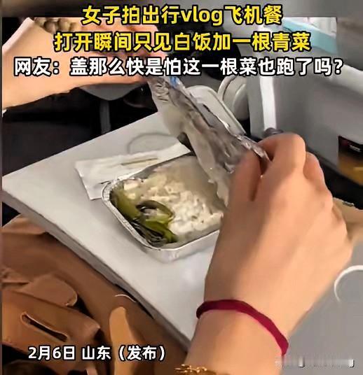 太离谱!飞机餐只剩一根青菜?真相笑中带泪! 山东女子拍飞行vlog,掀开餐盒只看到一碗白饭配一根青菜,吓得赶紧盖盖子,网友都笑她怕青菜跑了。没想到是场大乌龙,餐盒是双头设计,她只开了一半,另一边还有配菜。 虽说误会一场,但也戳中了大家的心声。经济舱餐食越来越敷衍,分量少、搭配简单,乘客的期待一次次落空。这场闹剧不是谁的错,却暴露了航司餐食体验的短板。 你坐经济舱遇到过最离谱的餐食是什么?快来评论区吐槽!