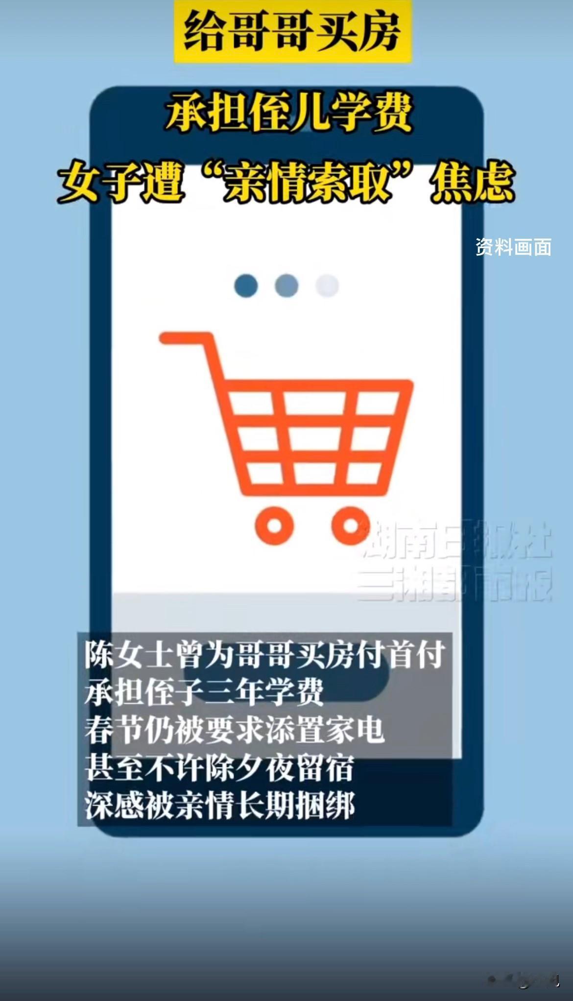 真的破防了!你能想象吗,一个女儿给哥哥买房出了首付,供侄子读了三年书,到头来,过年连在娘家住一晚的资格都没有。 湖南这位41岁的陈女士,就卡在了这个让人心塞的处境里。这么多年,她好像成了娘家的“固定提款机”和“全能后背”。哥哥买房子,她掏首付;侄子上学,她承担学费,一扛就是三年。可这些付出,换来的不是感激,而是一张越来越长的“需求清单”。 眼看要过年了,家里又开口了,让她给添置点“撑面子”的大件家电。这还不是最过分的,最扎心的是,她哥哥直接告诉她,除夕夜家里没地方给她住,让她自己另找去处。一边是不断加码的要钱,一边是连门槛都不让进的冰冷,陈女士彻底扛不住了,焦虑到只能去找心理医生求助。 接诊的医生一针见血,说她这是被“习惯性索取”和“角色绑架”给困住了。在家里人眼里,她这个“女儿”的角色,就等于“无私的奉献者”,她的付出被当成了天经地义,但他们从来不会去想,她自己也累,也需要被关心。 这事儿在网上炸开了锅,很多人看了都觉得憋屈,好像看到了自己的影子。有网友说,这哪是亲情,这明明是“重男轻女”的隐形剥削,好像女儿生来就是为了给儿子“输血”的。也有网友觉得,陈女士自己早该清醒了,一次次妥协,其实就是在纵容家人的贪心,把自个儿给耗干了。 心理医生给了几条实在的建议,比如,下次过节前提早跟家里沟通,明说“今年我手头紧,大件家电买不了,吃完饭我也得回去”。这叫设定预期,避免当场扯皮。再比如,当家人又抱怨或攀比时,别急着吵架,就温和但坚定地重复你的话:“我也得顾自己的小日子,这样安排最合适”。最关键的是,得把心思从“他们又要我干什么”转到“我怎么跟家人好好吃顿饭、聊聊天”上。亲情最宝贵的部分,原本就不是钱能买来的。 说到底,健康的家,不是一方无限地给,另一方无限地拿。它得有来有往,相互体谅,知道对方也有底线。真正的亲情,从来不是靠单方面的自我消耗来维持的。 如果你是陈女士,下一次家人再提出过分要求,你会怎么办呢?