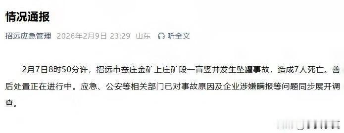 山东7人坠亡,其中有5名刚毕业大学生新工 9日,山东招远一金矿7人死亡,据悉,事故原因是检查罐笼时发生坠笼,当时两个老师傅带着5名新工正在检修,网友爆料5名新工都是刚毕业大学生,医护人员赶到现场时,7人已经无生命迹象。应急局已经介入调查,5名新工刚出校门就这样的走了,心痛啊