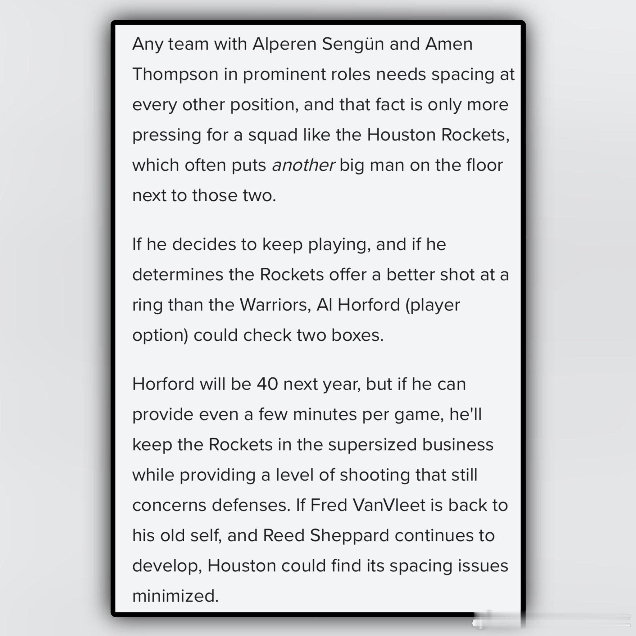 如果他决定继续征战,并且他认为火箭比勇士更接近总冠军,那么艾尔·霍福德(拥有球员选项)或许能同时满足这两个条件。