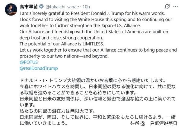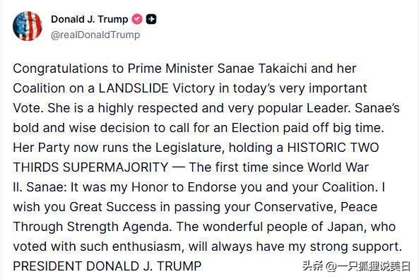 据海外多家媒体消息,当地时间8日,美国前总统特朗普在社交平台发文,向日本自民党干事长高市早苗及日本执政联盟致贺,祝贺其在当日日本众议院选举中斩获超半数席位。 特朗普在“真实社交”上表示,能支持高市早苗及其领导的执政联盟“深感荣幸”,还强调“热情参与投票的日本民众,会始终获得自己坚定不移的支持”。 日本广播协会报道称,此次众议院选举中,由自民党与日本维新会构成的执政联盟优势明显,成功拿下过半数议席。其中,自民党收获316席,日本维新会获得36席。在野党阵营里,立宪民主党与公明党携手组建的“中道改革联合”新党获49席,国民民主党获28席,参政党15席,新兴政党“未来团队”11席,日本共产党4席。 此前,当地时间2月5日,特朗普就曾在“真实社交”发文,回忆自己的访日之旅,称印象极为深刻,还热情邀请高市早苗于3月19日到访白宫,并明确表示“毫无保留且全方位支持”高市早苗及其执政联盟。 当地时间8日,高市早苗在社交平台用日英双语回应特朗普,她写道:“万分感激特朗普总统的温暖致辞,无比期待今年春天前往白宫。我将持续与特朗普总统携手,让日美同盟更加坚不可摧。”高市早苗认为,日美同盟与友谊,是建立在彼此深厚信任与紧密合作之上的。她还呼吁:“让我们齐心协力,让这一同盟持续为两国及更广泛地区带来和平与繁荣。” 值得一提的是,2025年10月28日,日本首相高市早苗与美国总统特朗普在东京举行首次会晤。然而,会晤期间,日本国内爆发大规模抗议活动。众多日本民众走上街头,举行抗议集会与示威游行,他们强烈谴责特朗普访日,对军备扩张以及将关税当作武器等行径表示不满,坚决反对日美强化军事同盟破坏地区和平稳定。