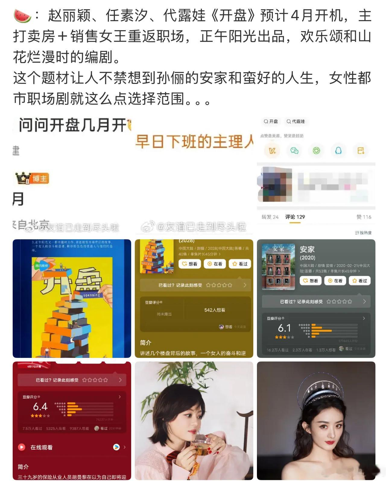 网友爆料赵丽颖《开盘》预计4月开机,主打卖房+销售女王重返职场,致敬孙俪的安家和蛮好的人生,这样爆款题材,接连作品扑街的情况下,这次大概率要爆吧~