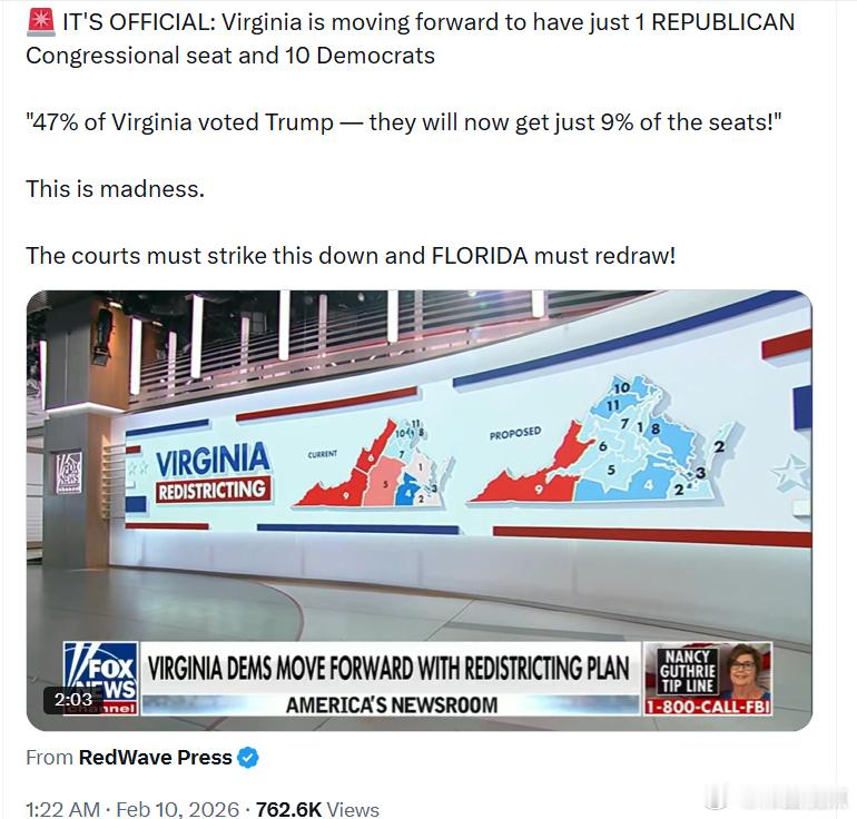 “弗吉尼亚州有47%的选民投票给特.朗.普——结果他们现在只能获得9%的席位!”