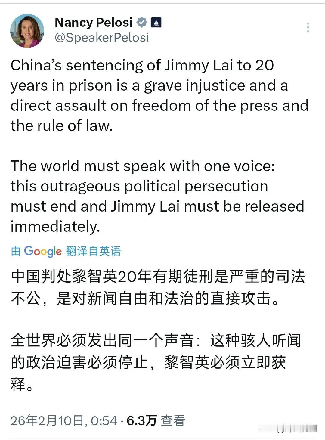 美国前众议长佩洛西今天(北京时间2月10日)发文叫嚣道:“中国判处黎智英20年有期徒刑是严重的司法不公,是对新闻自由和法治的直接攻击。全世界必须发出同一个声音:这种骇人听闻的政治迫害必须停止,黎佩英必须立即获释。” 评几句: 佩洛西再次就相关案件公开发声,对香港的司法判决说三道四。 这一幕,再次让大家看清了什么是赤裸裸的双重标准。 案件审理公开透明、证据确凿,20年刑期,是法治社会的公正结果。 同样是危害秩序的行为,他们在自己国内零容忍, 到了中国香港,却满口自由人权,横加指责。 只许自己严管,不许中国护法,这不是双标是什么? 香港早已重回稳定,中国的内政与司法主权, 轮不到任何外部势力指手画脚、随意干涉。 任何政治操弄都改变不了事实, 更动摇不了我们维护国家安全的坚定意志。 对于这种双重标准,你支持咱们的正义判决吗?
