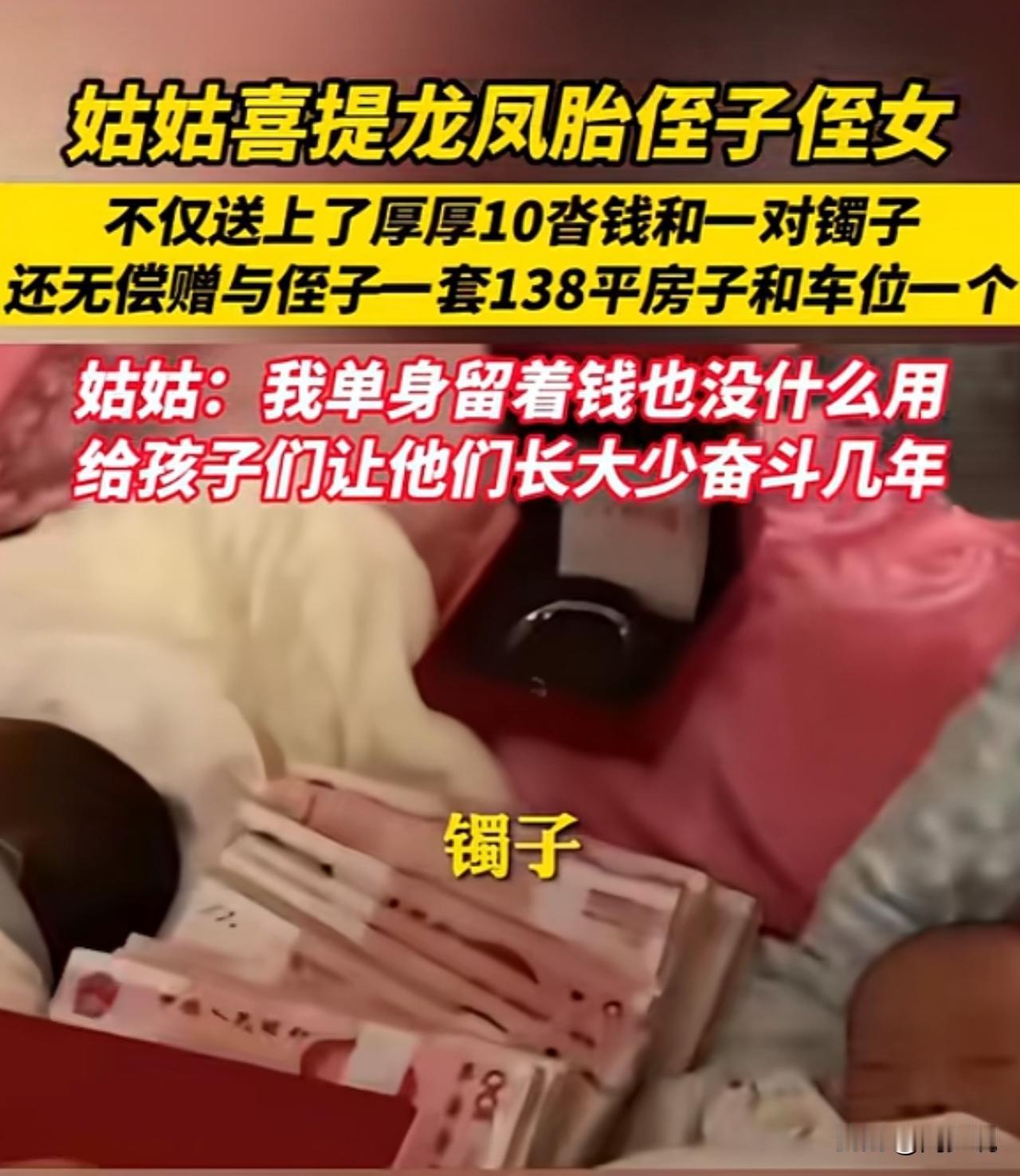 “羡慕了!”刷到一则暖心视频,家中喜添龙凤胎宝宝,姑姑的举动直接让网友直呼“人间好姑姑”。这位姑姑不仅包了厚厚的10沓红包,送上一对精致的镯子,更是直接拿出一套138平米的房子和车位,无偿送给刚出生的侄子侄女。面对家人的劝说,她笑着说:我单身,留着钱也没什么用,给孩子们,能让他们长大少奋斗几年。 简单一句话,戳中了无数人的心。众多网友纷纷感慨:“不是所有人都能做到这般大方,这份亲情太珍贵。” 也有人更是坦言:“真心为孩子着想的长辈,最难得。” 在周少看来,其实这份馈赠,远不止物质那么简单。姑姑不求回报的付出,藏着最纯粹的亲情,也在用行动告诉孩子,家人是永远的后盾。 从另一个角度来说,诠释了最好的教育,从来不是刻意的说教,而是藏在一言一行里的善意与担当,让人由衷敬佩。 这位姑姑用自己的方式,给孩子送上了最珍贵的人生礼物。物质的帮扶或许能让生活轻松几分,但这份刻在骨子里的温情与格局,才会伴随孩子一生,教会他们懂得爱与感恩。 亲情最动人的地方,向来是不计得失的牵挂,这样的暖心瞬间,也让我们明白,家人之间的真心,远比财富更有分量,这位姑姑值得让人称赞。#寻美三湘#