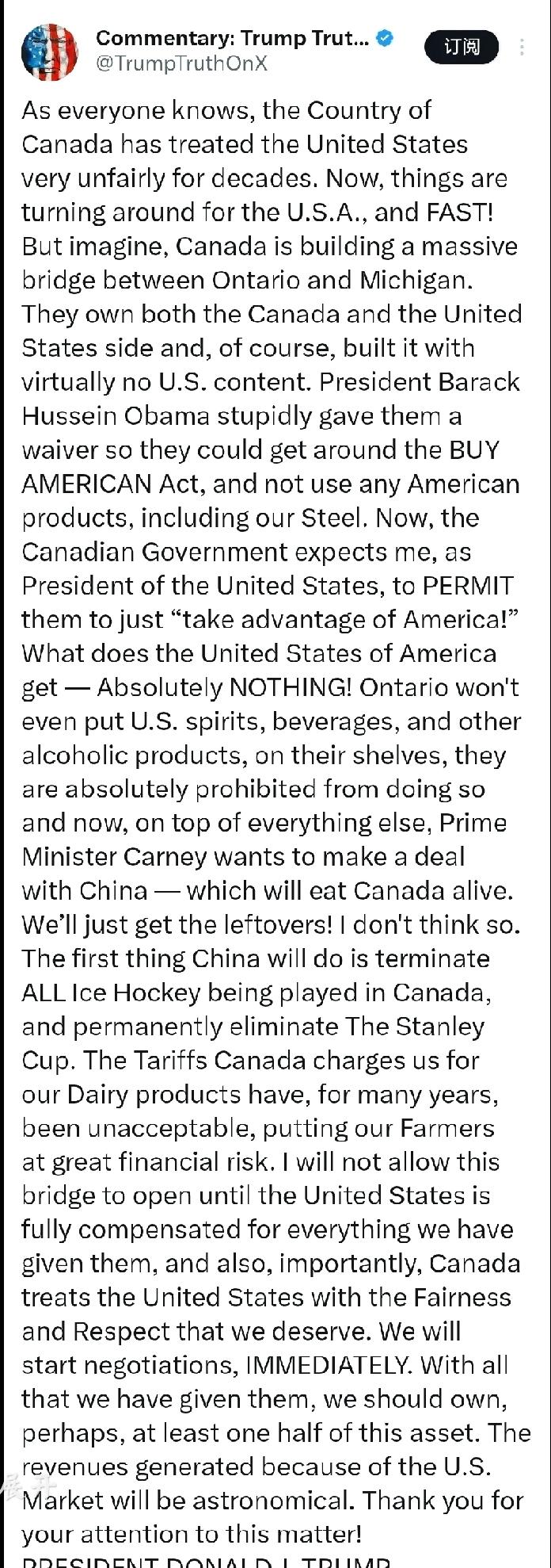 北京时间2月10日,美国总统特朗普,关于加拿大的发文如下:“众所周知几十年来,加拿大对美国极不公平,如今美国的处境正在迅速好转,但设想一下,加拿大正在安大略省和密歇根州之间修建一座巨大的桥梁,而桥梁的加拿大和美国一侧都归加拿大所有,当然,这座桥几乎没有使用任何美国材料。奥巴马总统愚蠢的给予了他们赦免,现在加拿大政府竟然指望我,作为美国总统允许他们占美国的便宜,美国能得到什么,什么也得不到!安大略省甚至不允许销售美国烈酒……现在雪上加霜的是,卡尼总理还想与中国达成协议,这种使加拿大不堪重负,我们只能捡些残羹剩饭,我可不这么认为,中国首先会做的就是终止所有在加拿大举行的冰球比赛,在加拿大给予美国我们所有付出的补偿之前,我不会允许这座桥通行。鉴于我们给予加拿大的一切,我们至少应该拥有这座桥一半的所有权。美国市场带来的收入将是天文数字。” 个人认为:美国总统特朗普的这篇文章,真是让人耳目一新,不得不佩服特朗普居然能够把背信弃义,霸权霸凌作风,表现的如此大义凛然,如此理所应当。 了解一下背景,加拿大安大略省桥梁一事,加拿大按照协议已经出资64亿美元推进项目进行,完全遵照此前达成的协议。 如果美国总统特朗普把与盟友的合作协议当作武器,谋求美国单方面的利益最大化,妄想用霸凌手段使得盟友们放弃应该得到的利益。 个人认为:这种把合作协议当做武器,满足美国一己之私,是一次性的?还是长期化?有待观察。 如果是长期化,那么恭喜美国暂时会取得全球大部分利益归美国的结果。可是美国失去的是信任-信誉-信用。