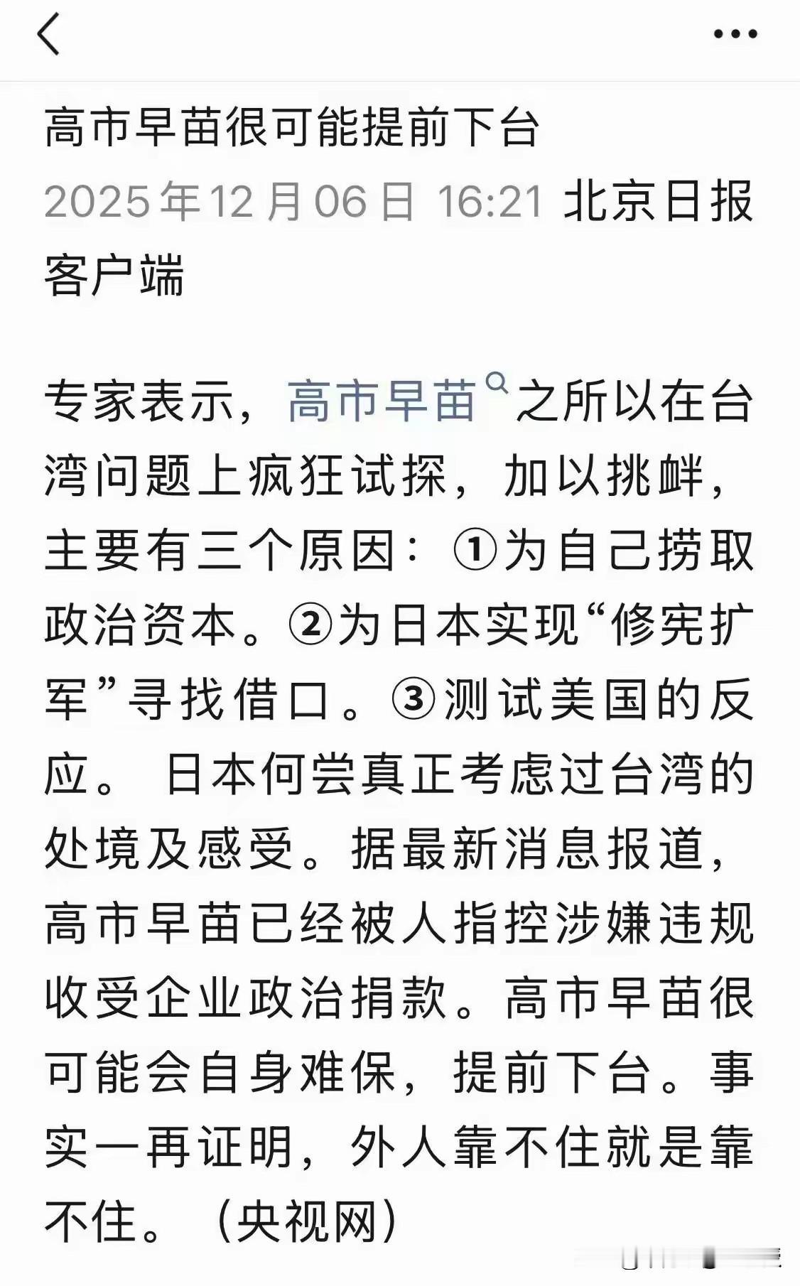 之前我们国内的很多专家都预测高市早苗会提前下台,我不管当时他们的理由有多么充分,只要专家不是故意的,只能说明一件事,那就是误判。 一个人误判无所谓,如果所有专家集体误判,那就很可怕了,代表国家层面也有可能误判了日本,误判一个对我们充满仇视的国家,这将是致命的。 幸好,我说幸好高市早苗这次胜出,还是高票胜出,我们还有机会纠正误判。不然后果无法想象。