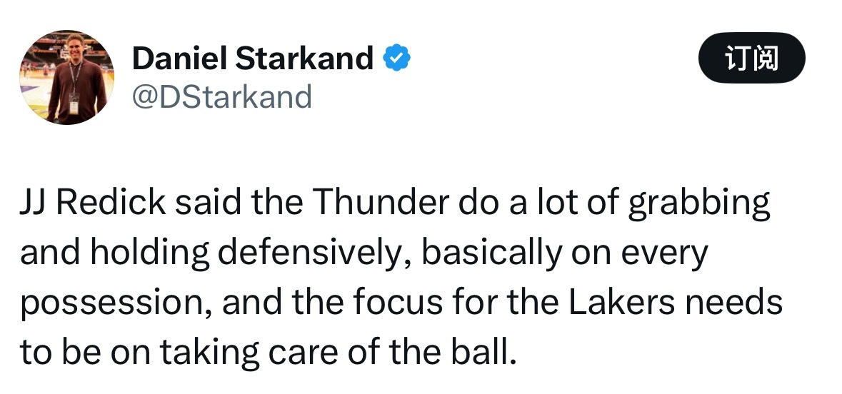赛前就开火?!哈哈!雷迪克表示,雷霆队在防守时大量使用拉拽、抱人动作,几乎每个回合都有,湖人队的重点必须放在保护好球上。