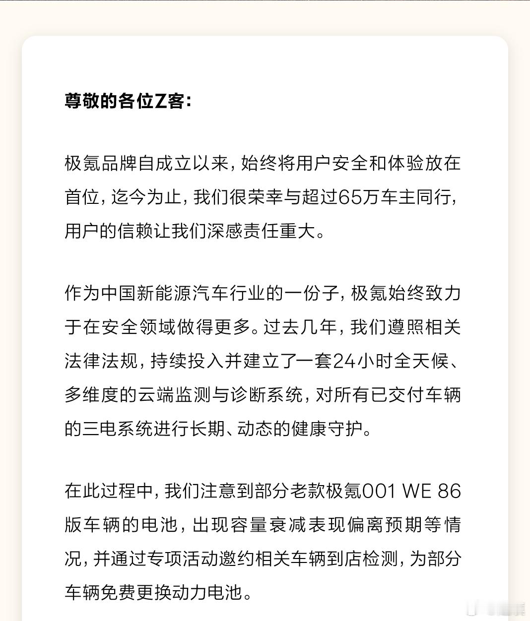 召回后将为免费更换电池,并且不影响三电质保。免费换十几万的电池,这不相当于白开了几年车。