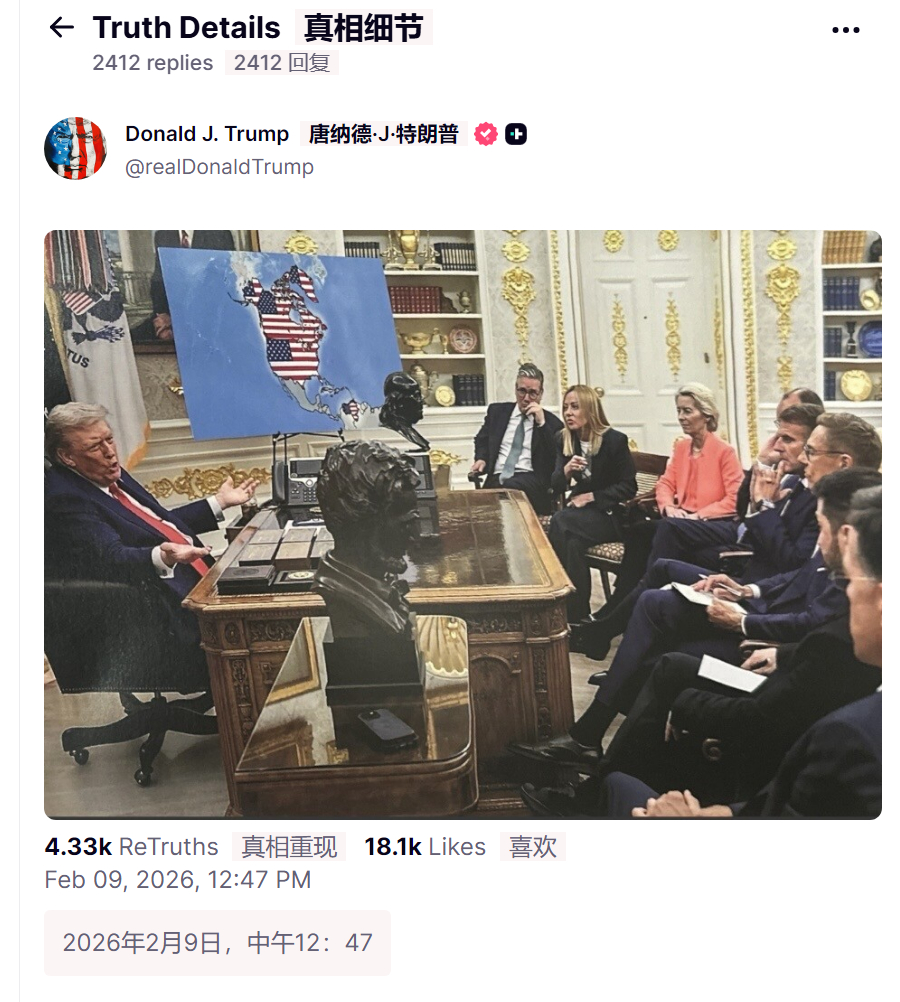 🔻特朗普再次发布了那张与欧洲领导人交谈的照片,背景中有一幅地图将格陵兰岛和加拿大描绘为美国领土的一部分。🔻via realDonaldTrump🔻又要开始干格陵兰和加拿大了?热点现场 海外新鲜事 特朗普说中场秀是对美国的侮辱