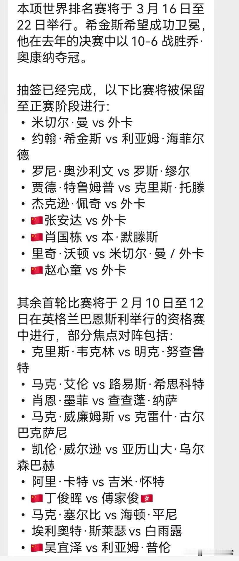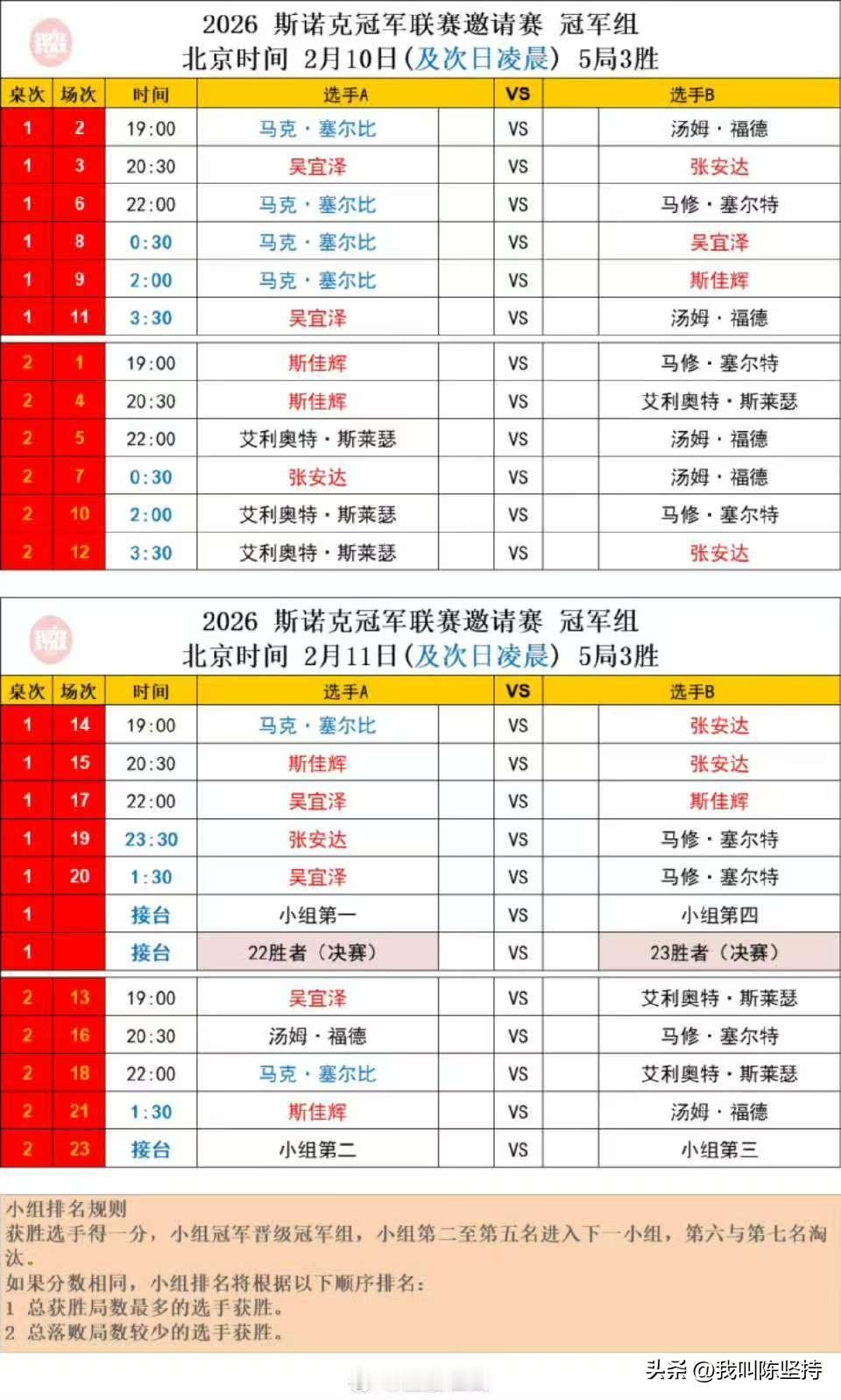 斯诺克烽烟再起,这几日赛程值得收藏。 今天开始两项比赛,第一是冠军联赛的总决赛,第二是玉山公开赛的资格赛。 冠军联赛分7个小组,小组的冠军参加总决赛,福德、赛尔特、塞尔比、斯莱瑟加上3名中国选手吴宜泽、斯佳辉和张安达组成总决赛阵容。 前天刚刚在香港大奖赛拿下亚军的张安达风尘仆仆赶往英国,参加本次比赛。 今天晚上8点30分,吴宜泽对阵张安达。凌晨还有张安达的两场比赛。冠军联赛是抢3的比赛,偶然性很大。中国选手还从来没有拿到过总冠军,期望本次能有所突破。 今天同时开始的有玉山公开赛的资格赛,令人意外的是,丁俊晖也参加本次资格赛,而不是参加延期资格赛。参加延期资格赛的球员有赵心童、特鲁姆普、奥沙利文、肖国栋、张安达等。 今天雷佩凡、徐思、贺国强、刘宏宇、常冰玉、张家玮、吴安仪、姚朋成8名中国球员参赛。比赛从晚上6点开始。