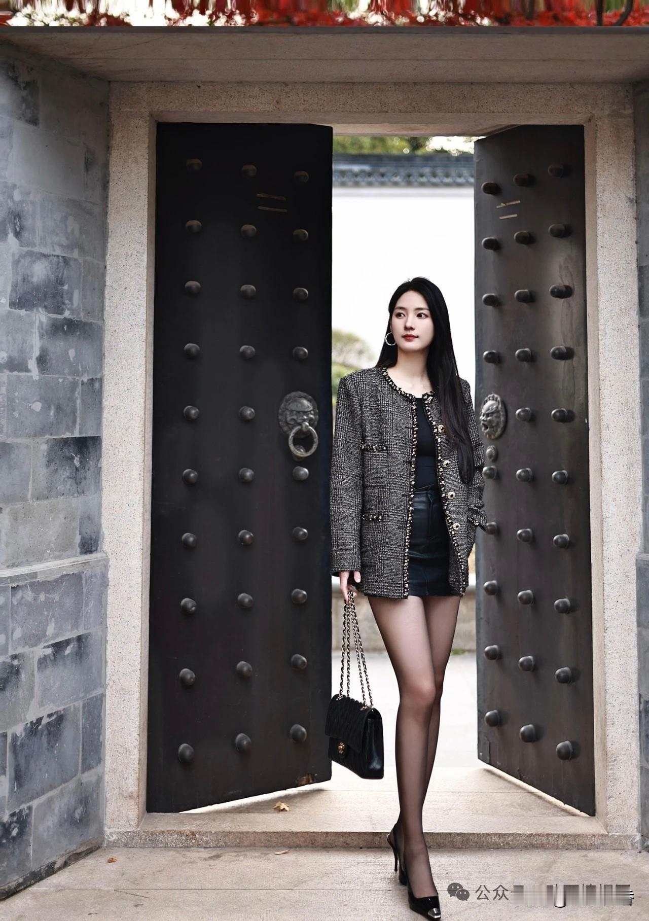 秋日红叶下的优雅时光,黑裙与红叶相映成趣。