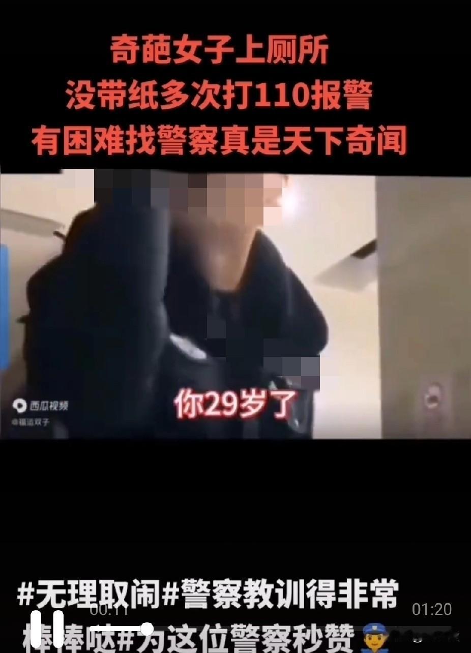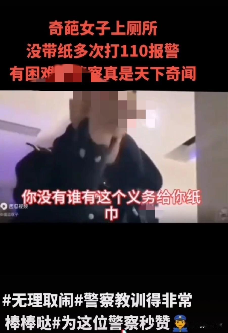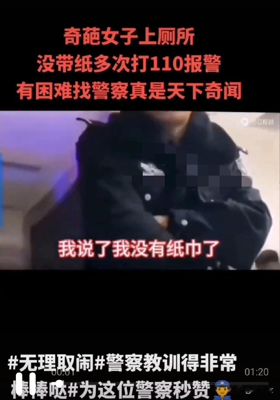 太奇葩了!女子上厕所没带纸,多次打110报警,还各种无理取闹! 女子:我没有纸巾了! 帽子叔叔:你没有纸巾就可以多次报警了! 女子:我没有纸巾了(撒娇,声音渐渐大了)! 帽子叔叔:你29岁了,出门上厕所不记得带纸? 女子:不是有困难小叔叔吗! 叔叔:你是在浪费警力你知道吗?还多次拨打! 女子:就让你们带纸怎么了! 叔叔:你可以去投诉,这么大人了,还这么儿戏! 看完为叔叔点个赞,女子真是太奇葩了,自己的错还要别人去买单,还无理取闹,不会有人惯着你!