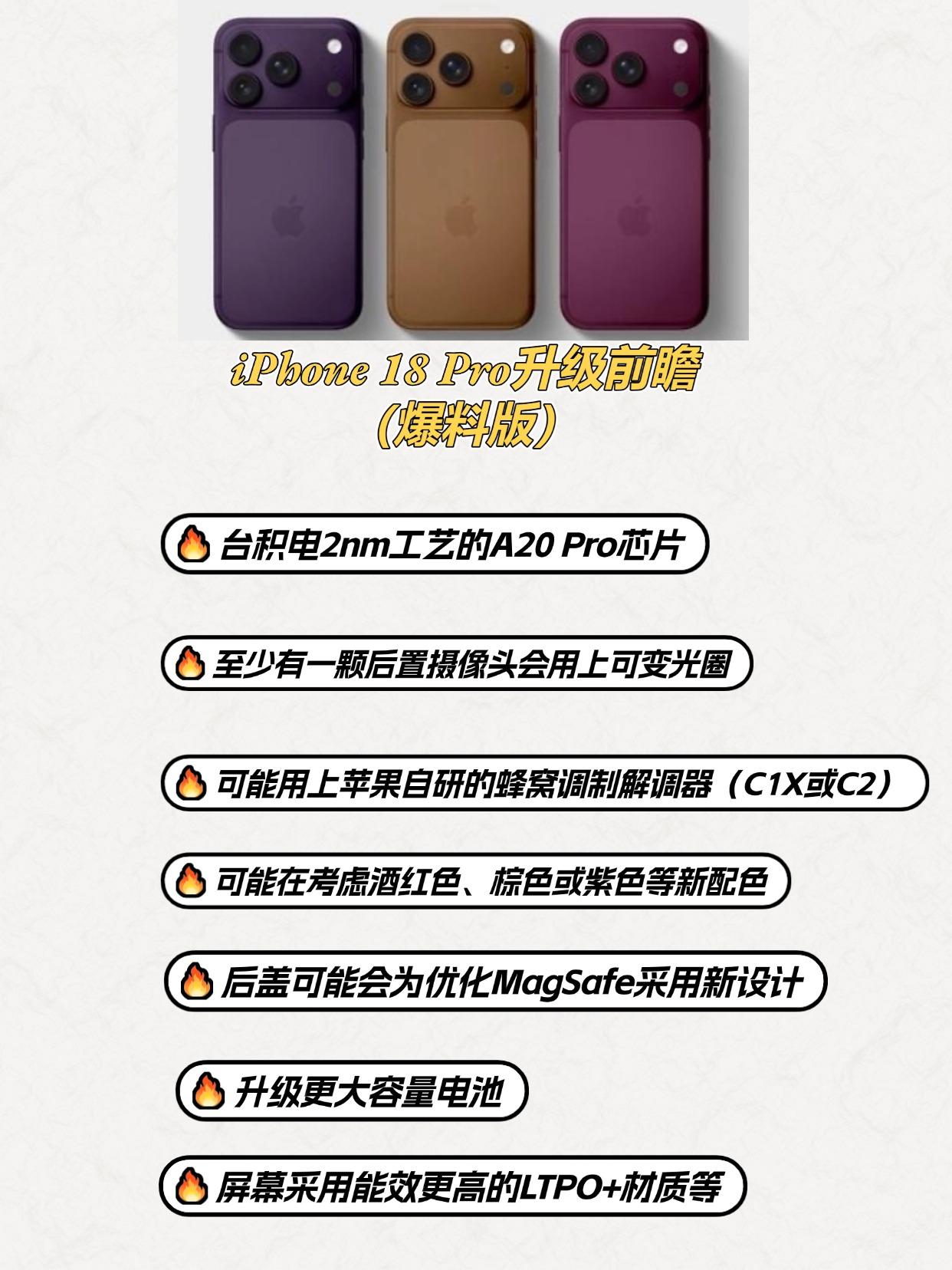 外媒总结了可能有的12项升级特性,最引人关注的可能是关于“灵动岛”的变化:之前传的“挖孔屏”不会来了,但因为部分Face ID组件移到屏下,所以灵动岛的显示区域会变得更窄。 ✨ 一些有意思的升级点: 性能核心:搭载台积电2nm工艺的A20 Pro芯片,预计能效会更好。 影像升级:至少有一颗后置摄像头会用上可变光圈。 网络与连接:可能用上苹果自研的蜂窝调制解调器(C1X或C2),并支持通过卫星进行网页浏览(不只是发消息)。 外观新意:可能在考虑酒红色、棕色或紫色等新配色,后盖可能会为优化MagSafe采用新设计(比如雾面玻璃)。 其他细节:Pro Max机型可能会稍微增厚一点(可能是为了塞进更大电池),屏幕采用能效更高的LTPO+材质等。 总的来说,iPhone 18 Pro系列看起来是在芯片、影像、网络能力和外观细节上进行了一次扎实的“堆料”升级。你对哪个新功能最感兴趣?科技资讯早知道[话题] iphone小技巧[话题] 科技数码新鲜事儿[话题]