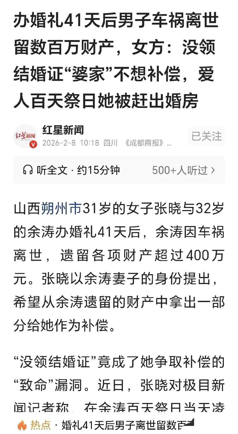 千万别高估人性!山西朔州,一31岁女子与32岁男子举办婚礼但未领证,共同生活41天后男子车祸身亡。女子以妻子身份料理后事,却被婆婆在男子百天祭日赶出婚房。婆婆曾承诺补偿30万后反悔,还起诉要求女子返还49.7万彩礼,女子随即反诉,要求分割200万遗产。 这事刚爆出来的时候,不少人都气得骂婆婆太绝情,也有人说女子是冲着400万来的。可仔细捋一遍,谁都不是绝对的赢家,只有一地鸡毛的难堪。 女子这边,刚办完婚礼41天就成了“未亡人”,以妻子的身份操办丧事,端灵、抱骨灰盒、打砂锅,一样没落。在她心里,自己早就是这个家的人了,丈夫走了,她理应得到一点保障。可没领证这事,像一道无形的墙,把她挡在了合法继承的门外。婆婆承诺的30万,成了她最后的指望,可这份口头承诺,转头就成了泡影,甚至还被倒打一耙,要她返还近50万的彩礼。被四个男人赶出婚房的那天,她手里攥着的,恐怕只有满心的委屈和对人性的失望。 婆家这边,刚失去儿子,白发人送黑发人,心里的痛不比任何人少。他们觉得女子操办丧事是情理之中,却忘了她在这个家里付出的真心。承诺30万又反悔,或许是沉浸在悲痛中无暇顾及,或许是觉得女子狮子大开口,可不管怎么说,出尔反尔的做法,确实寒了人心。把女子告上法庭要回彩礼,看似是维护自己的权益,可在旁人眼里,更像是在儿子尸骨未寒时,就急着把“儿媳”扫地出门,连最后一点情分都不顾了。 最讽刺的是,这场闹剧的根源,居然是一张没领的结婚证。在很多人眼里,办了婚礼、拜了堂,就算是夫妻了,那张红本本好像只是个形式。可真到了出事的时候,法律只认那张证,不认那些吹吹打打的仪式。没有结婚证,女子就没有继承权,婆婆的口头承诺也成了空话,两家人的情分,在利益面前不堪一击。 现在双方对簿公堂,女子反诉要分200万,婆家要她返还近50万彩礼。不管最后判决结果如何,都已经输了。输了感情,输了体面,也输了对逝者的尊重。那个刚走的男子,恐怕到死都没想到,自己留下的财产,会成为两家人互相撕扯的由头。他以为办了婚礼就是一辈子,却忘了在现实面前,没有法律保障的感情,脆弱得不堪一击。 这事也给所有准备结婚的人提了个醒:别把仪式感当成安全感,别把婚礼当成婚姻的全部。那张结婚证不只是一张纸,更是对彼此的保障,是在意外来临时,能让你站得住脚的底气。不管感情多好,该走的法律程序一定要走,别等出事了,才追悔莫及。 各位读者你们怎么看?欢迎在评论区讨论。